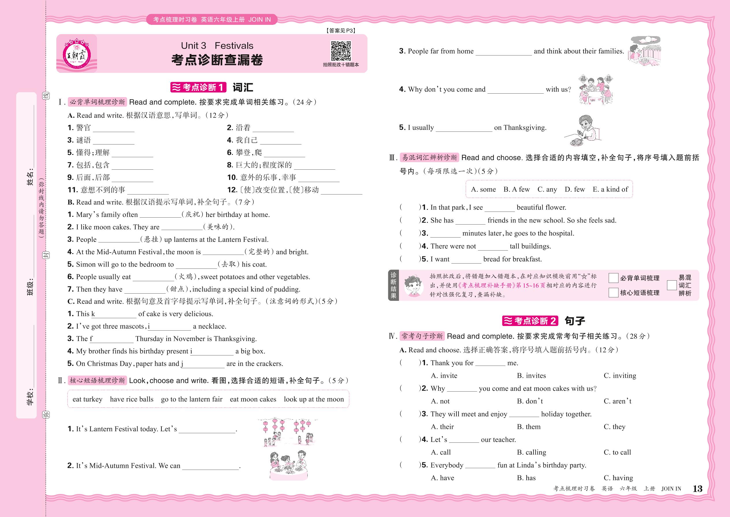 2024秋上册六年级英语剑桥版 Unit 3 考点诊断查漏卷