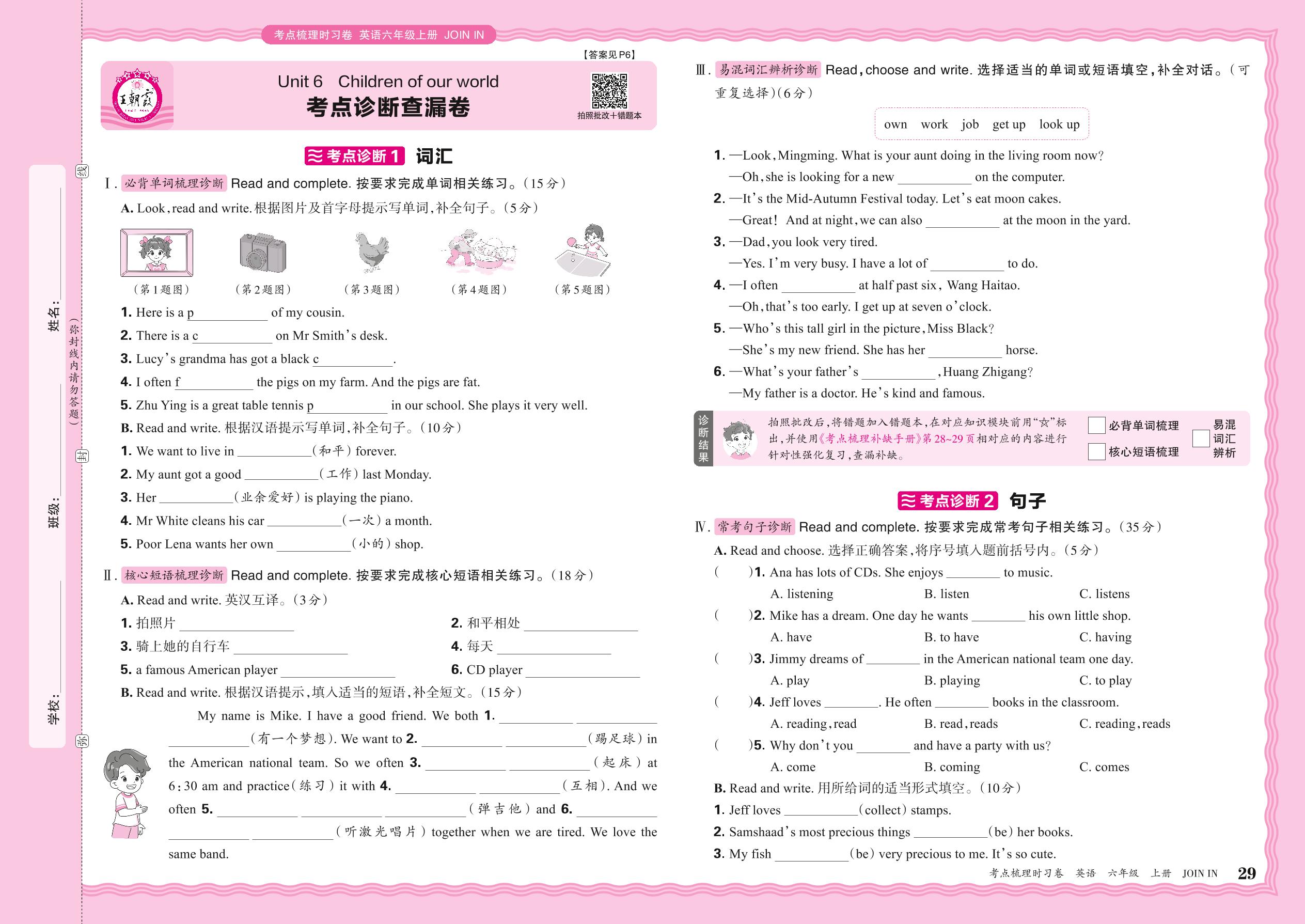 2024秋上册六年级英语剑桥版 Unit 6 考点诊断查漏卷
