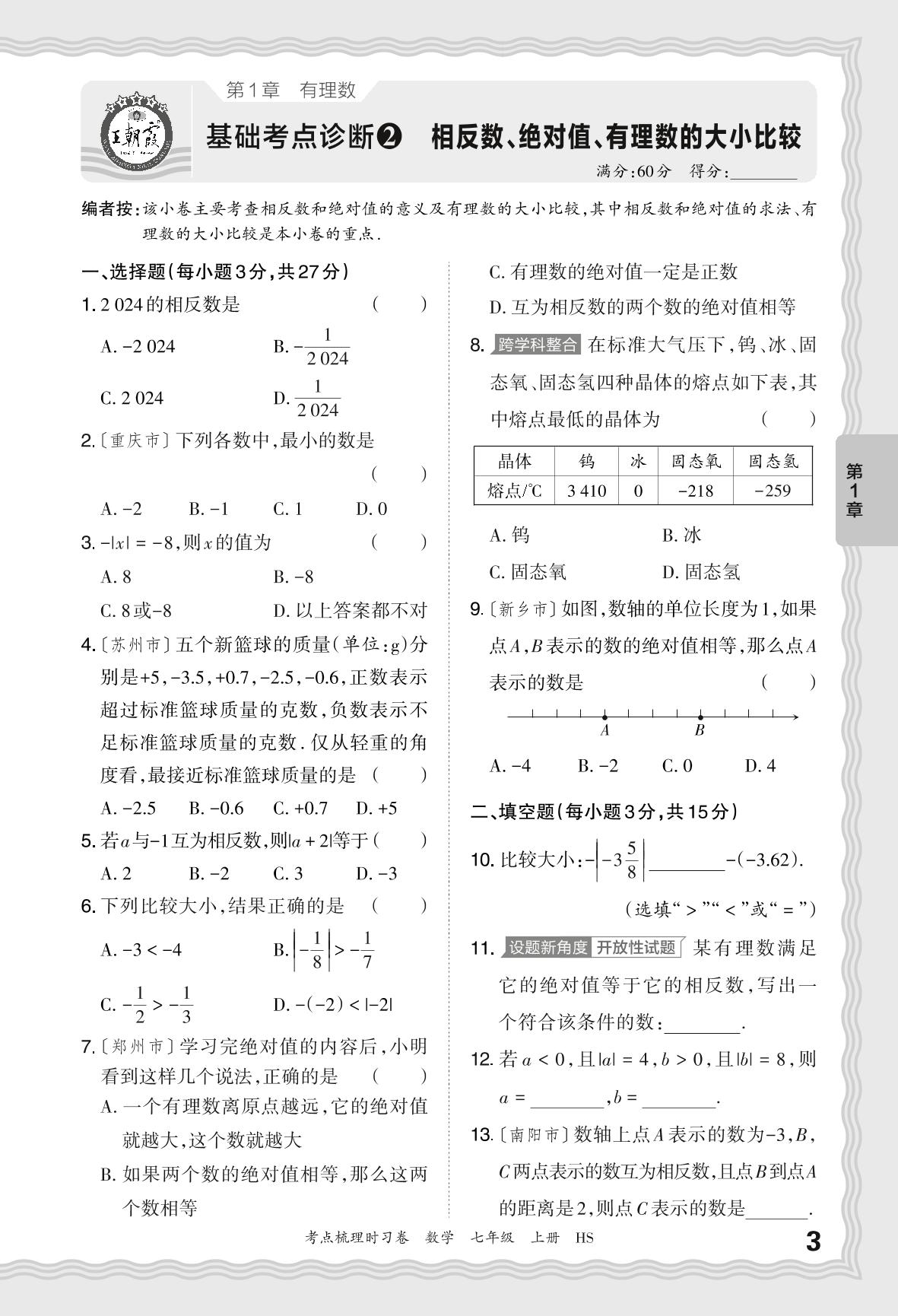 2024秋上册七年级数学华师版 第1章 基础考点诊断 相反数、绝对值、有理数的大小比较【2】