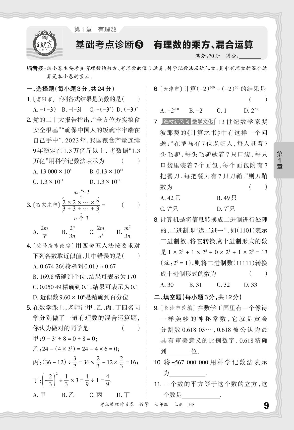 2024秋上册七年级数学华师版 第1章 基础考点诊断 有理数的乘方、混合运算【5】