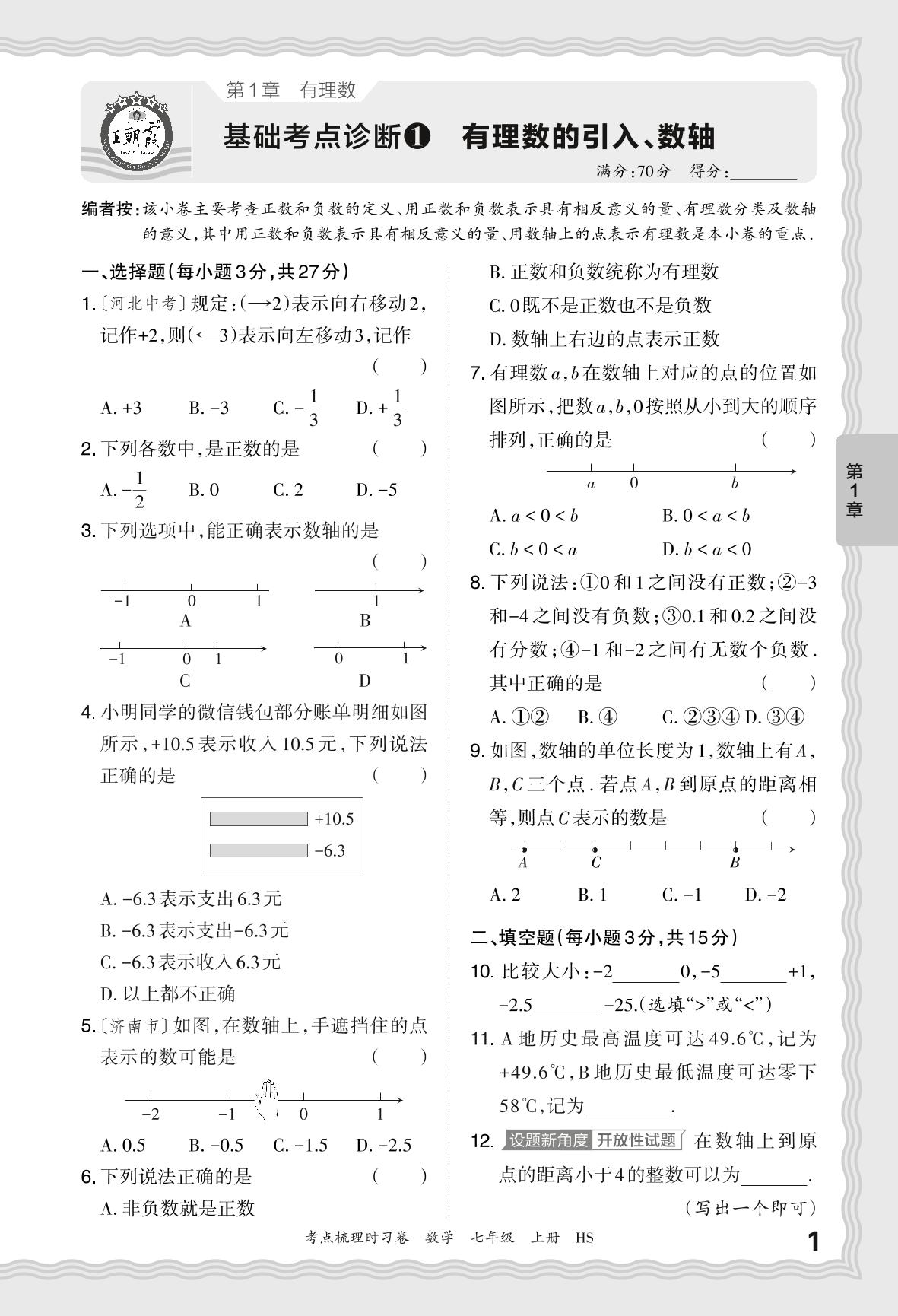 2024秋上册七年级数学华师版 第1章 基础考点诊断 有理数的引入、数轴【1】