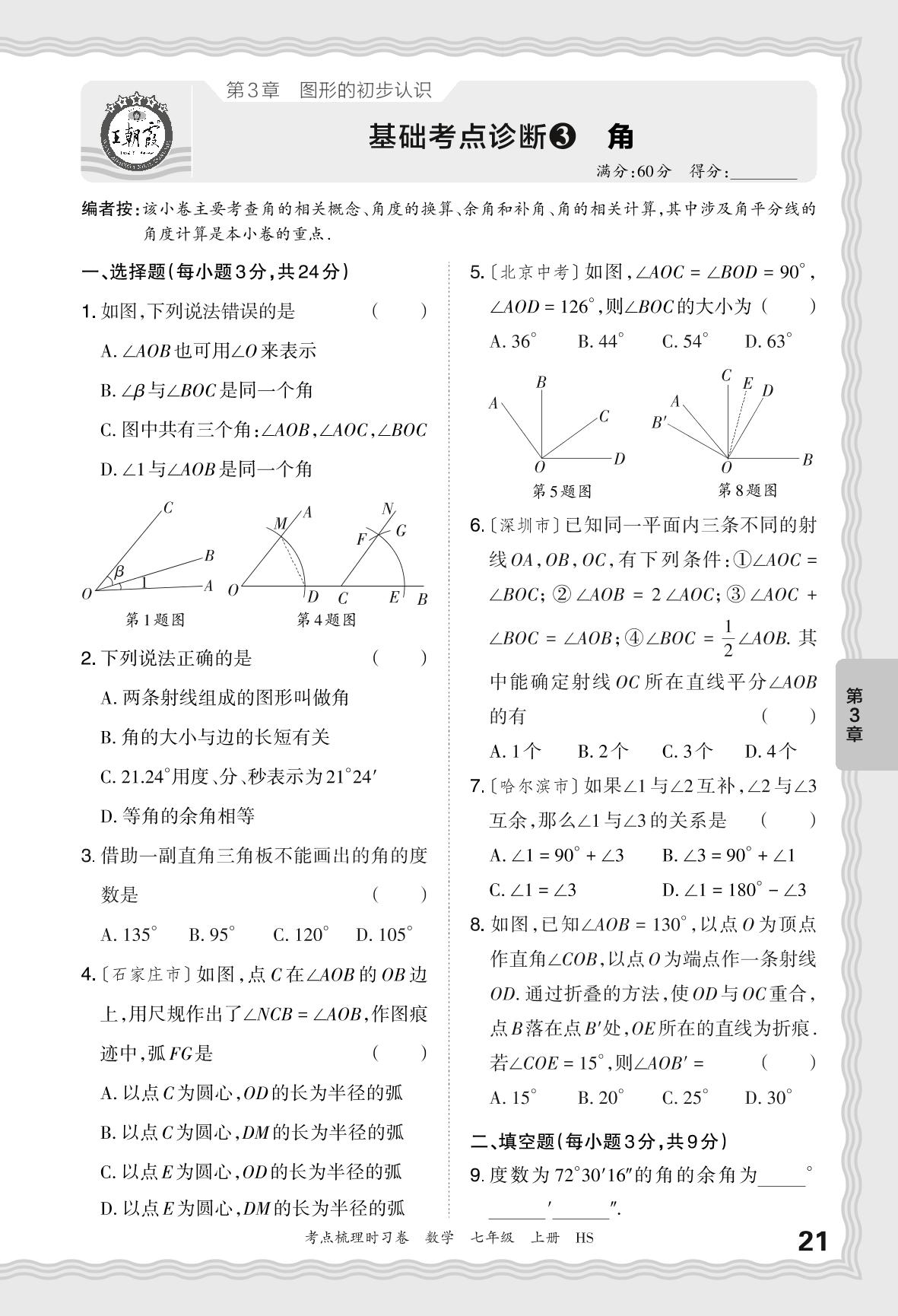 2024秋上册七年级数学华师版 第3章 基础考点诊断 角【3】