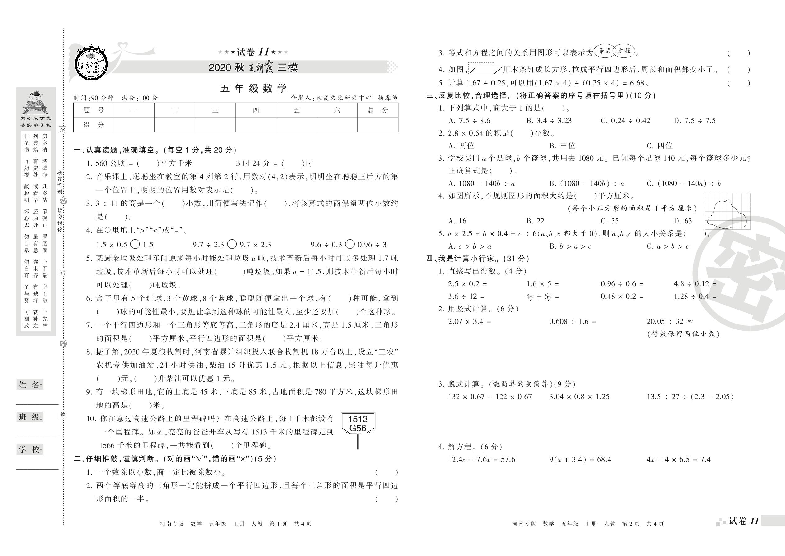 王朝霞期末模拟卷五年级上册数学(人教版)_R210804164032【11】