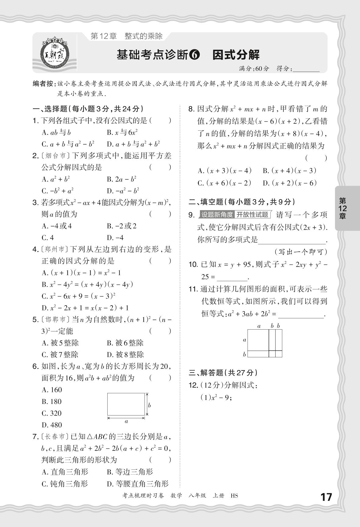 2024秋上册八年级数学华师版 第12章 基础考点诊断 因式分解【6】