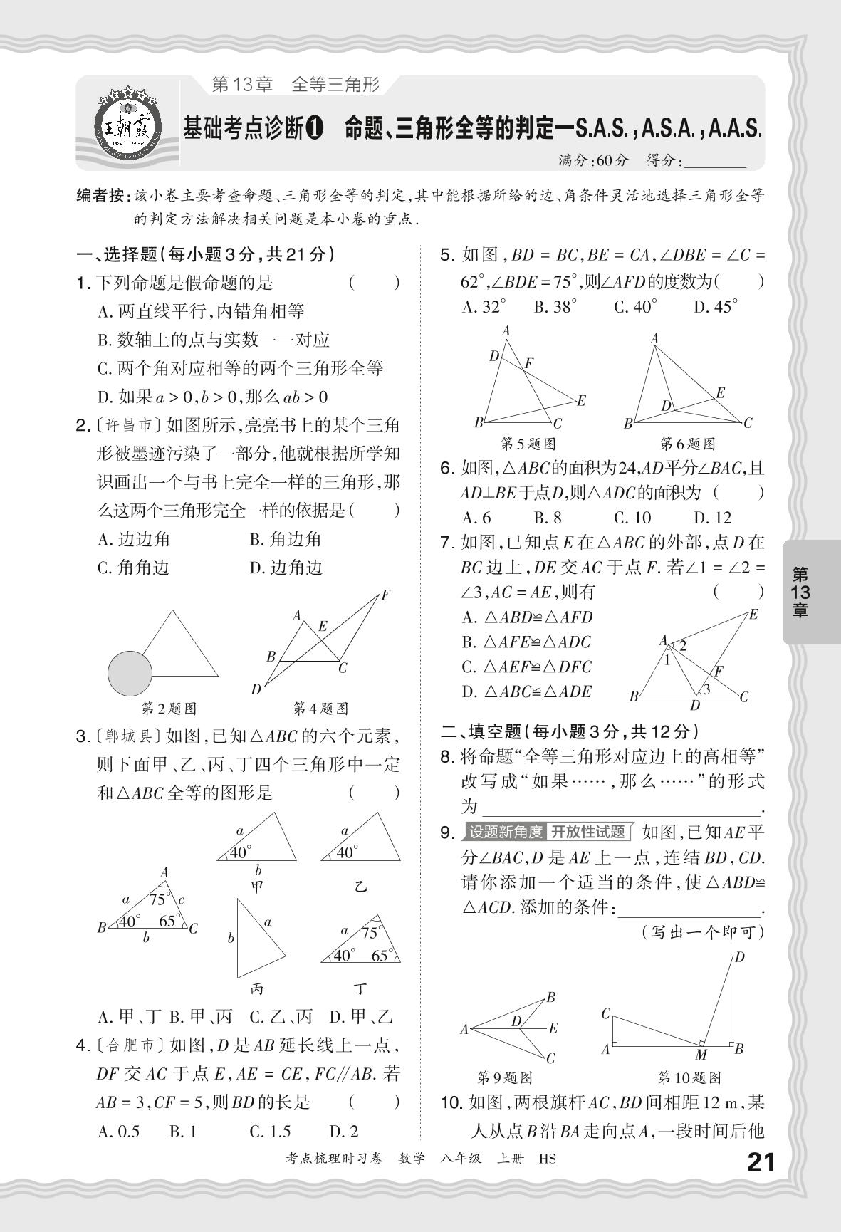 2024秋上册八年级数学华师版 第13章 基础考点诊断 命题、三角形全等的判定—S.A.S.,A.S.A.,A.A.S.【1】