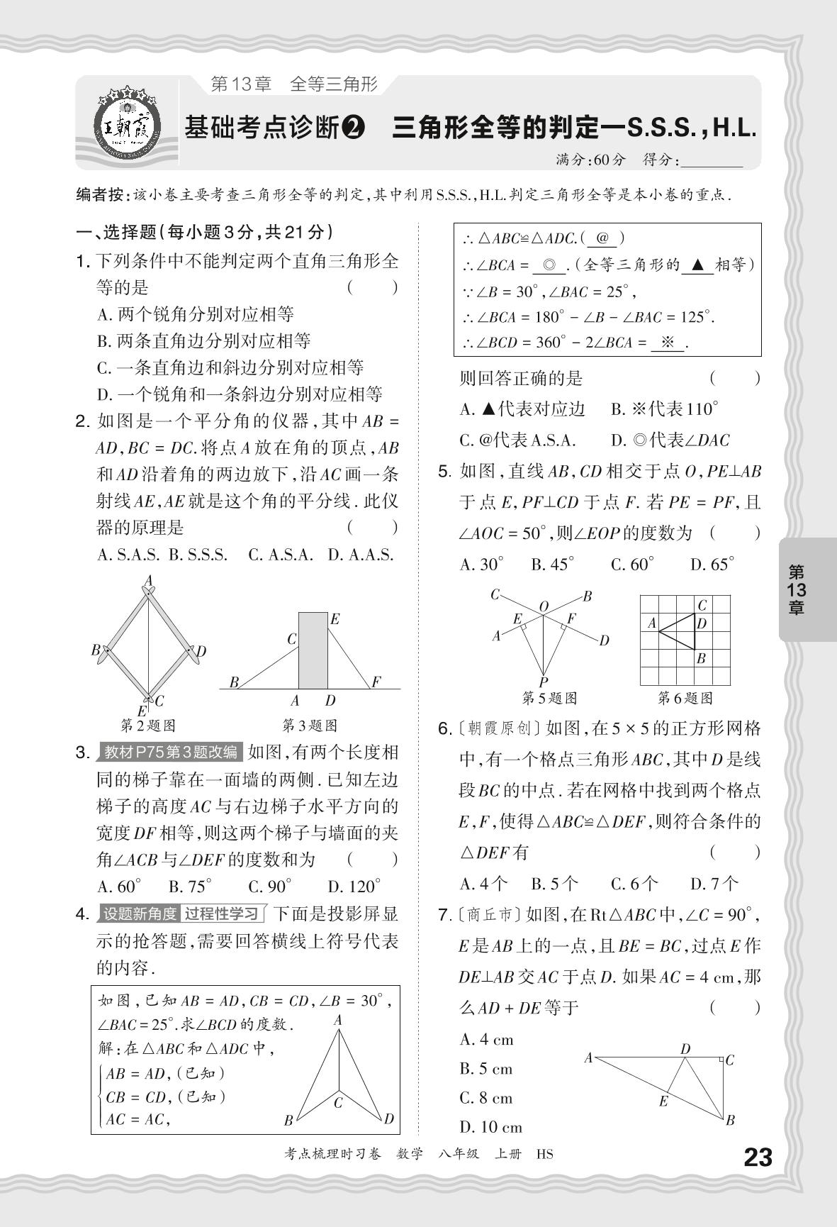 2024秋上册八年级数学华师版 第13章 基础考点诊断 三角形全等的判定-S.S.S.,H.L.【2】