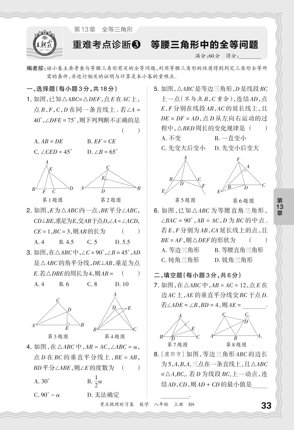2024秋上册八年级数学华师版 第13章 重难考点诊断 等腰三角形中的全等问题【3】
