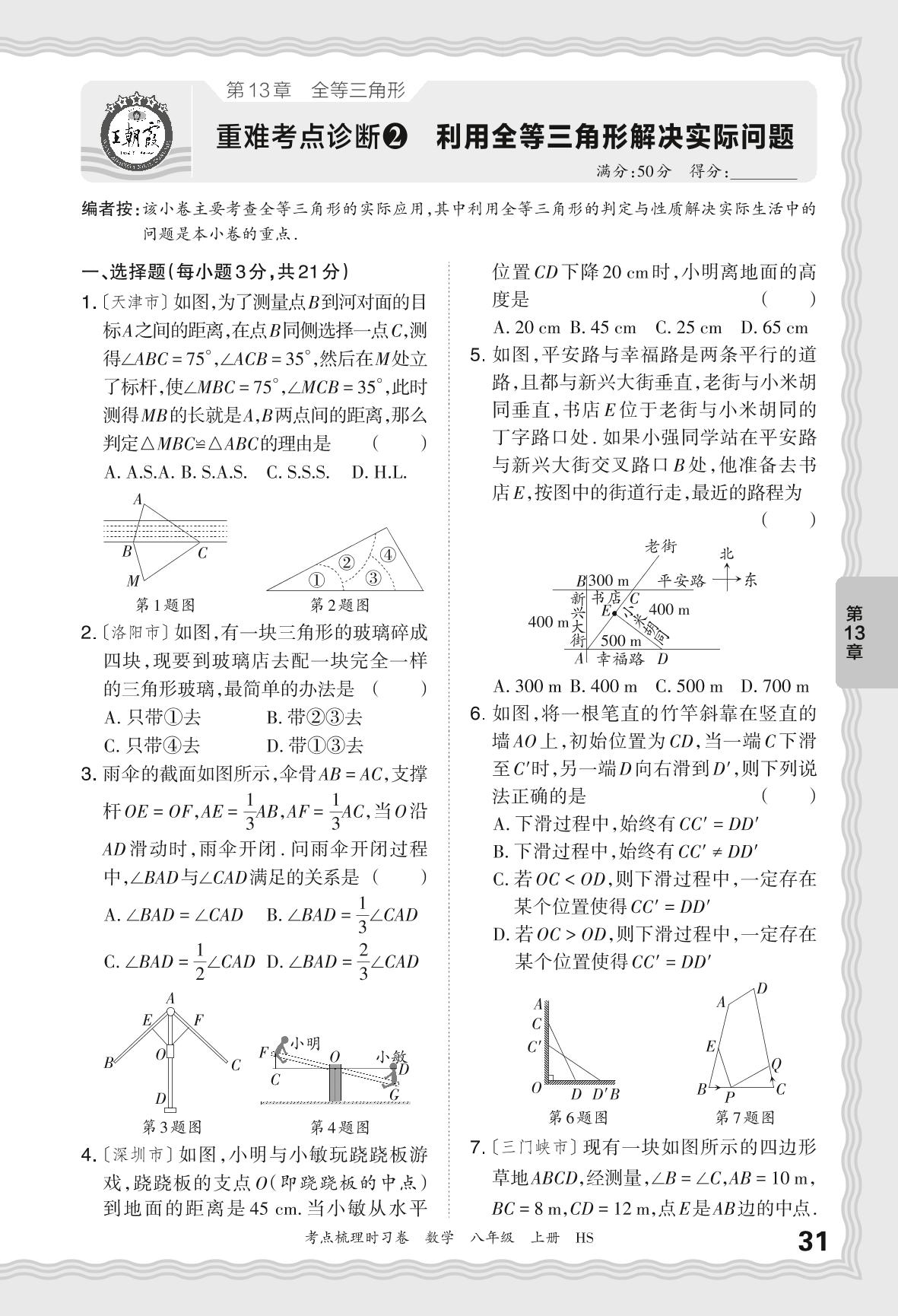 2024秋上册八年级数学华师版 第13章 重难考点诊断 利用全等三角形解决实际问题【2】