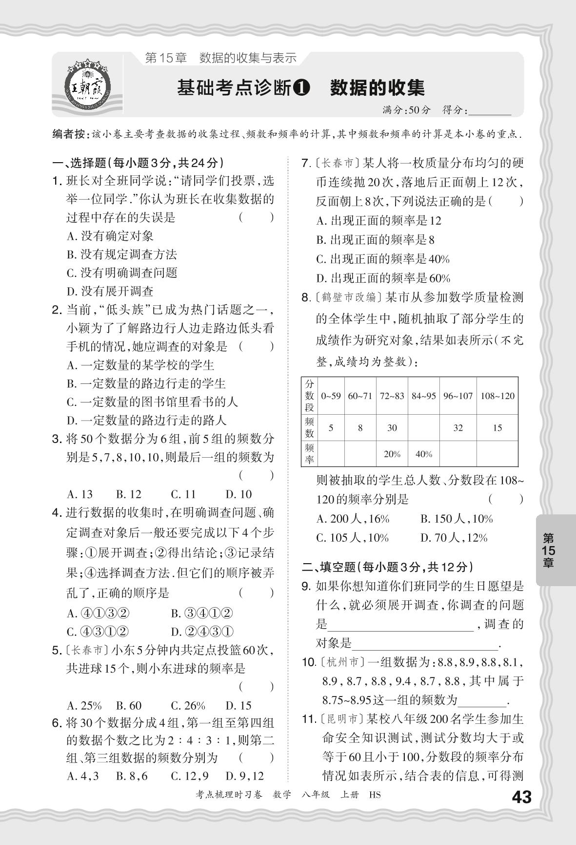 2024秋上册八年级数学华师版 第15章 基础考点诊断 数据的收集【1】
