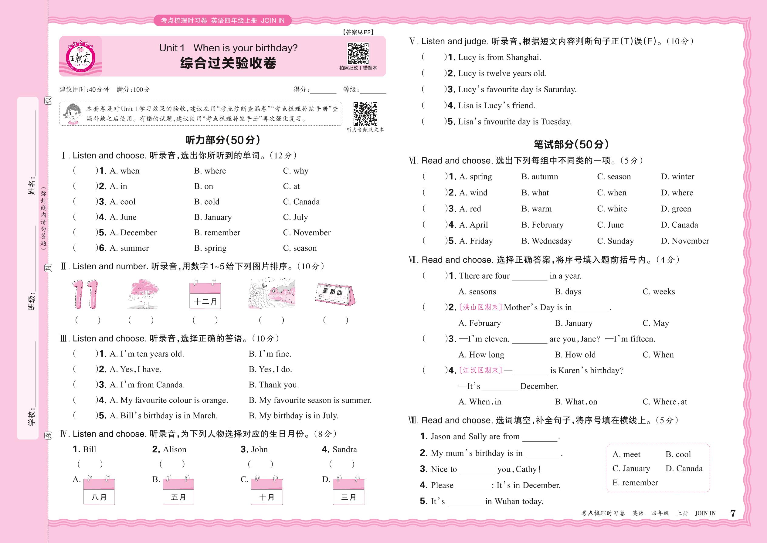 2024秋上册四年级英语剑桥版 Unit 1 综合过关验收卷