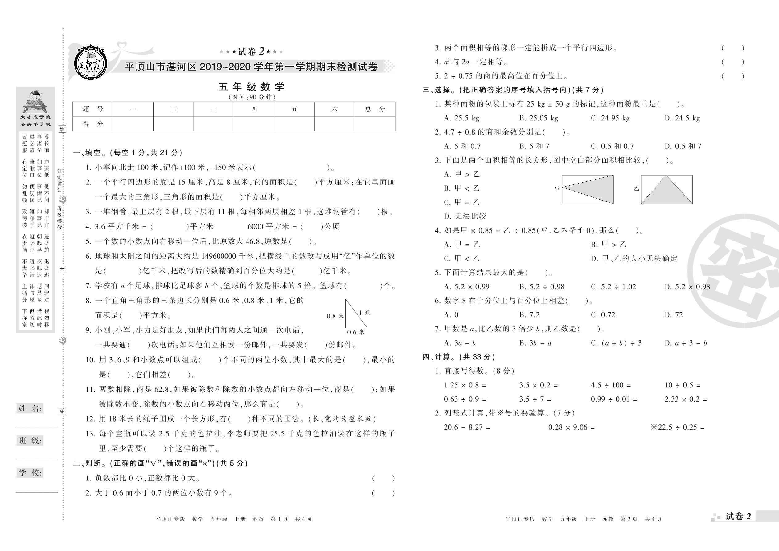 2019-2020学年第一学期平顶山市湛河区五年级数学试卷(苏教版)【2】