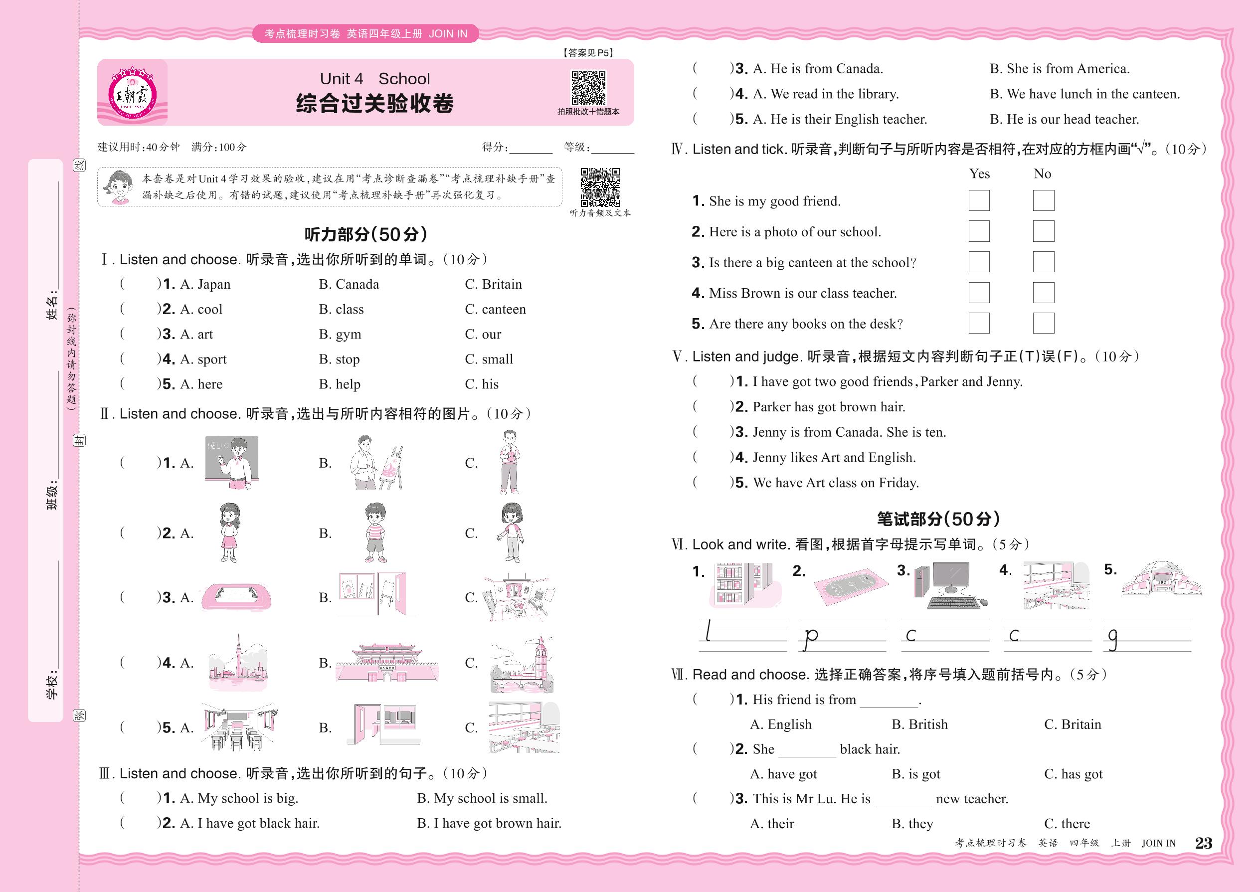 四年级英语剑桥版上册单元卷