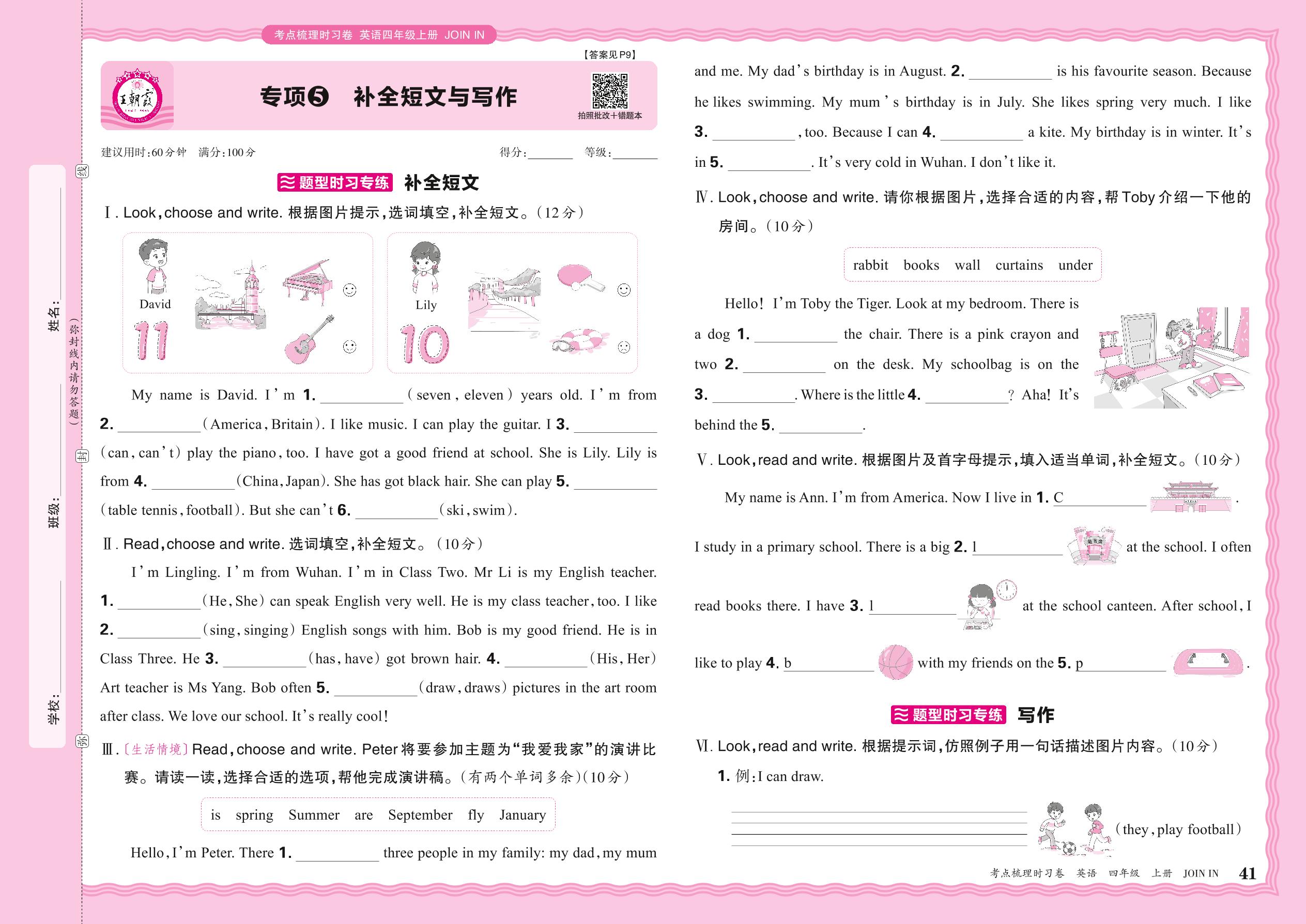 2024秋上册四年级英语剑桥版 期末专项卷PY版·补全短文与写作【5】