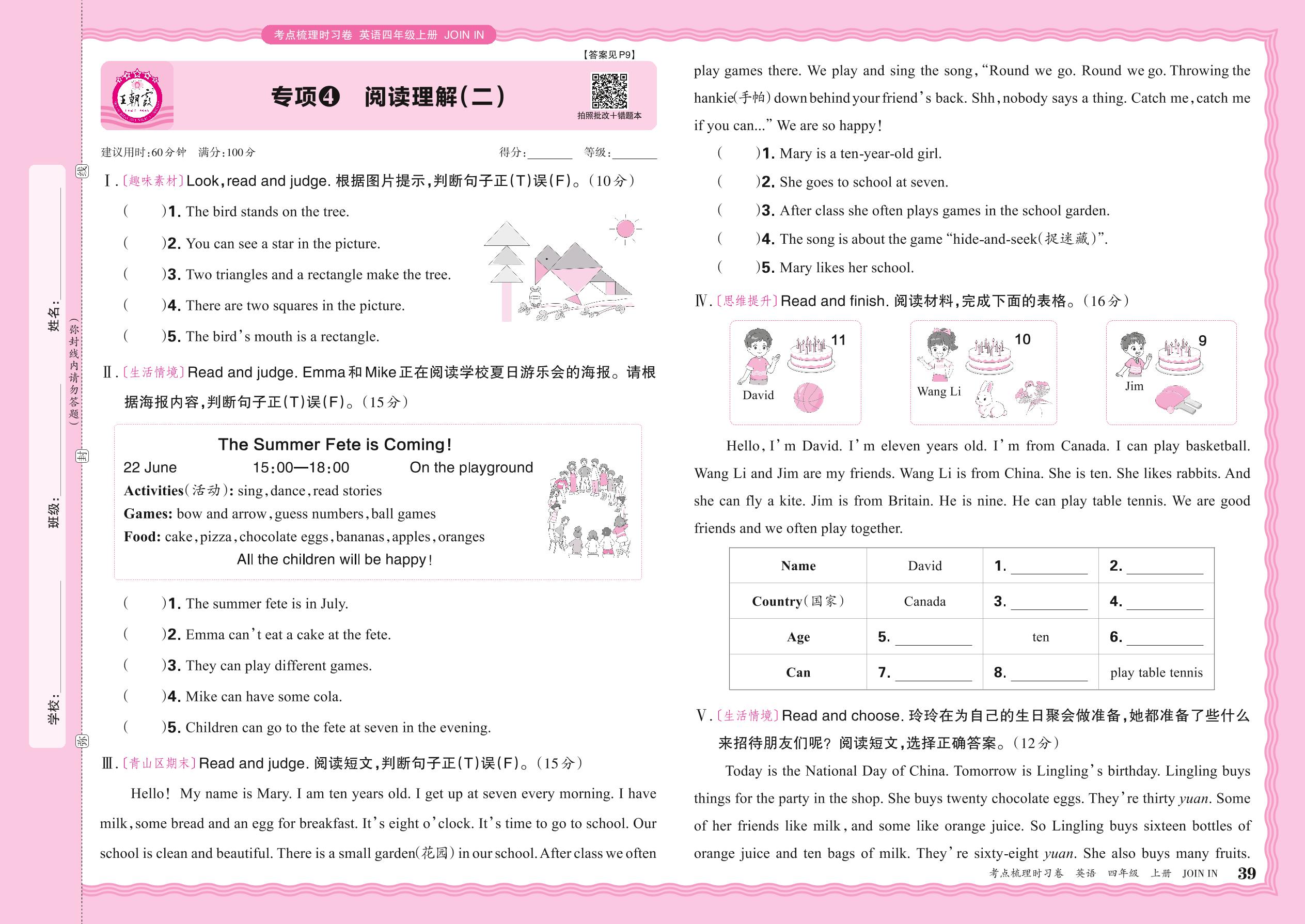 2024秋上册四年级英语剑桥版 期末专项卷PY版·阅读理解(二)【4】
