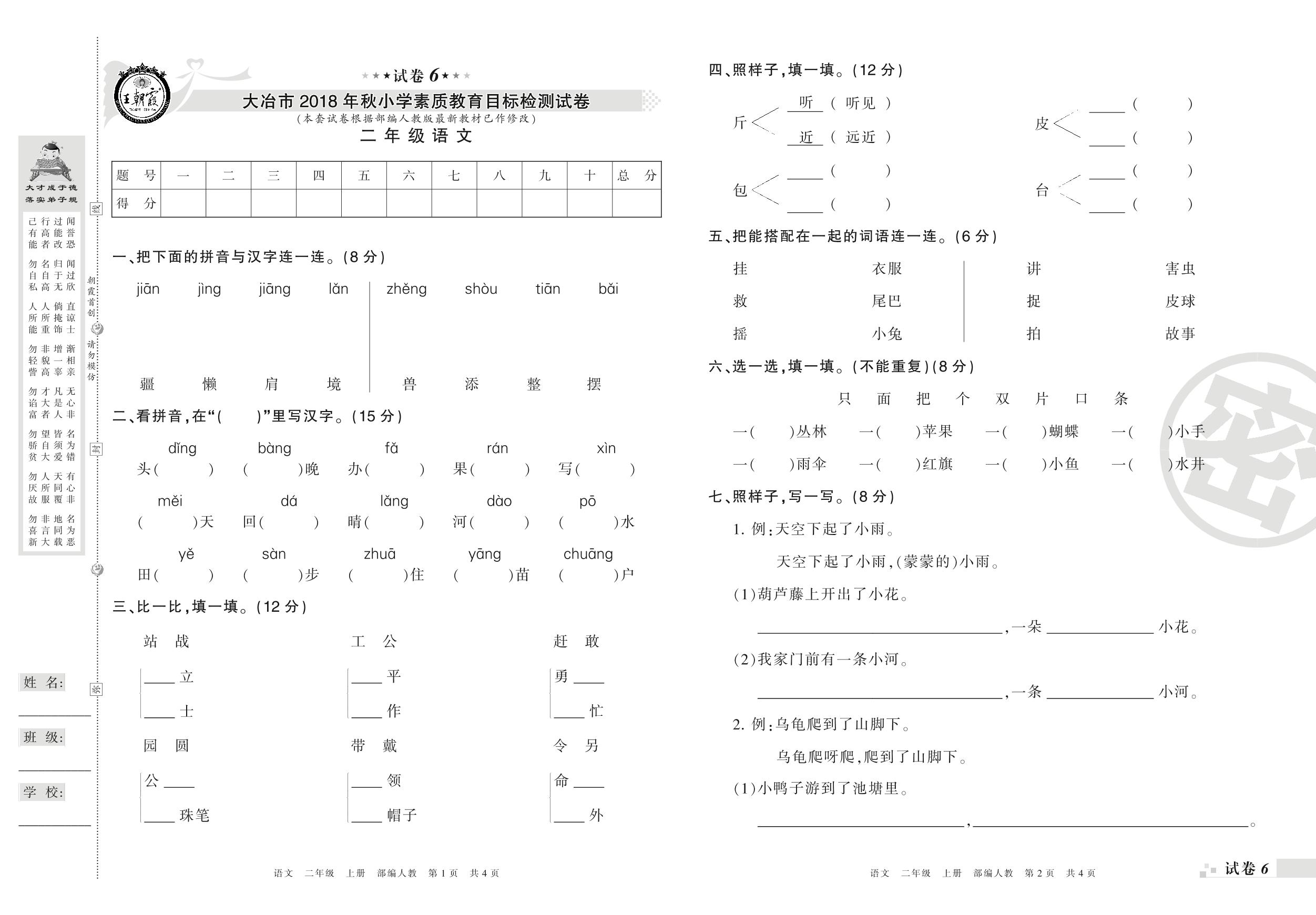 2018-2019学年第一学期大冶市二年级语文试卷(人教版)【6】