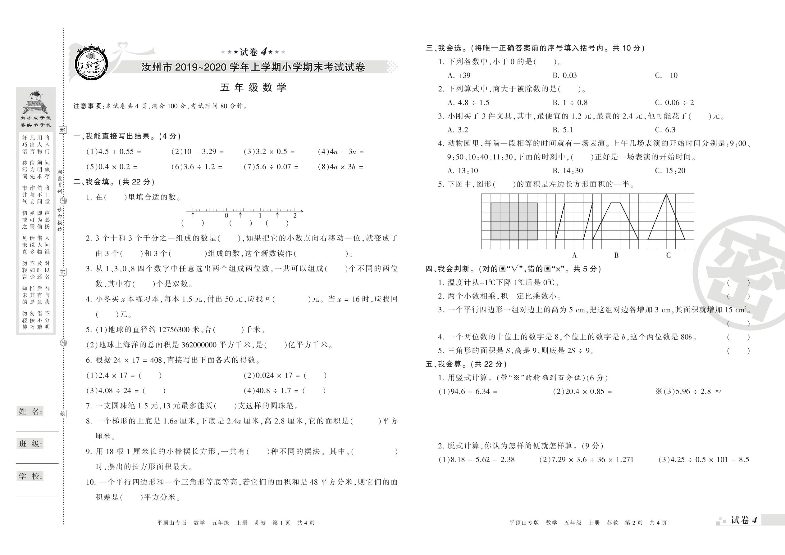 2019-2020学年第一学期汝州市五年级数学试卷(苏教版)【4】