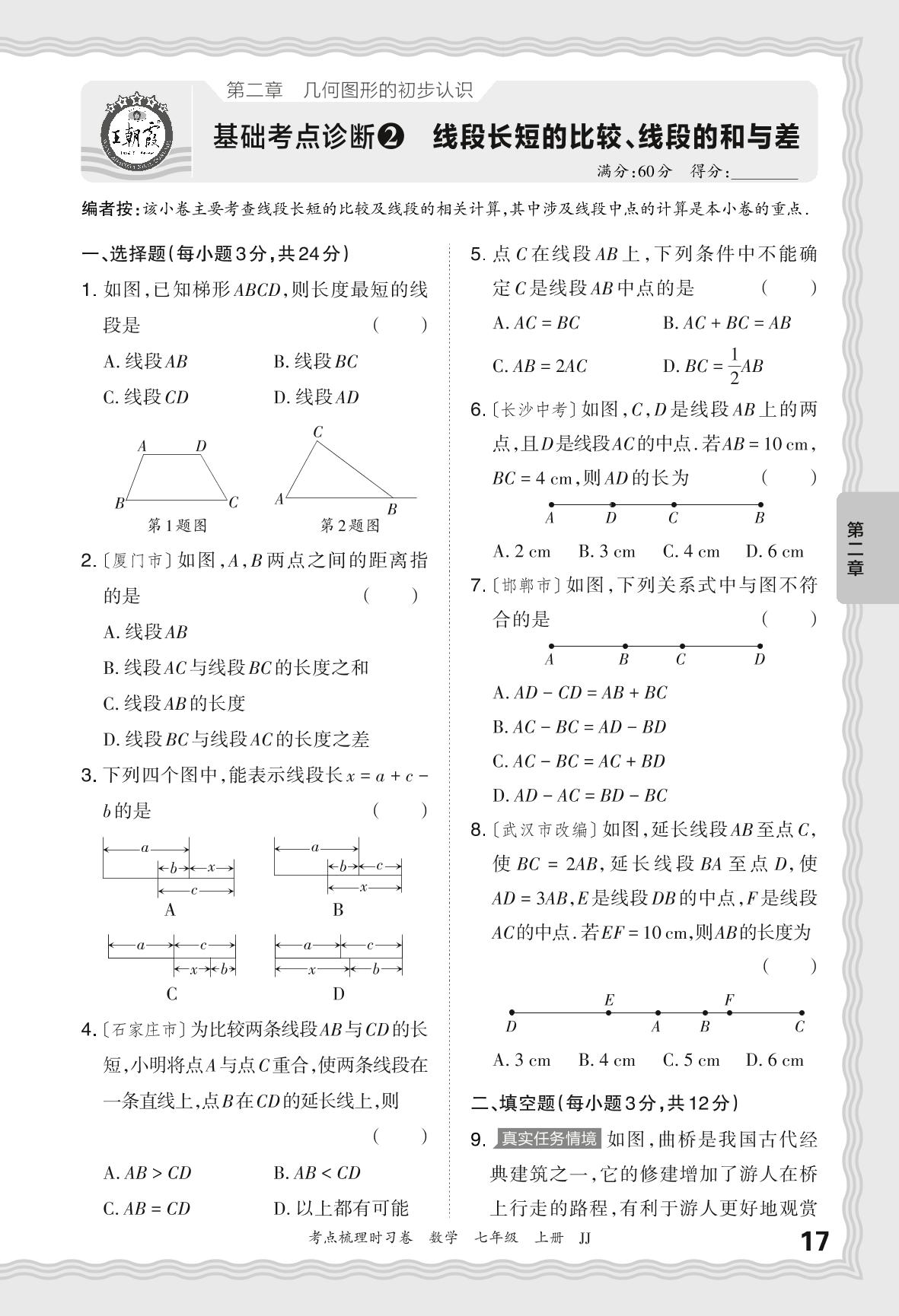 2024秋上册七年级数学冀教版 第二章 基础考点诊断 线段长短的比较、线段的和与差【2】
