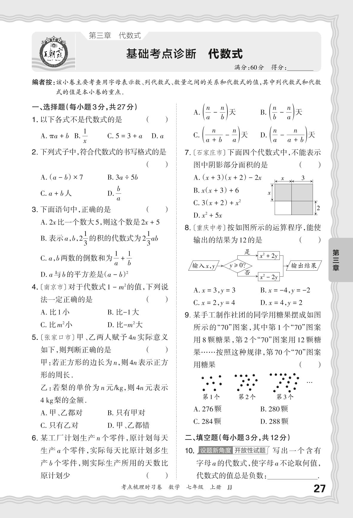 2024秋上册七年级数学冀教版 第三章 基础考点诊断 代数式
