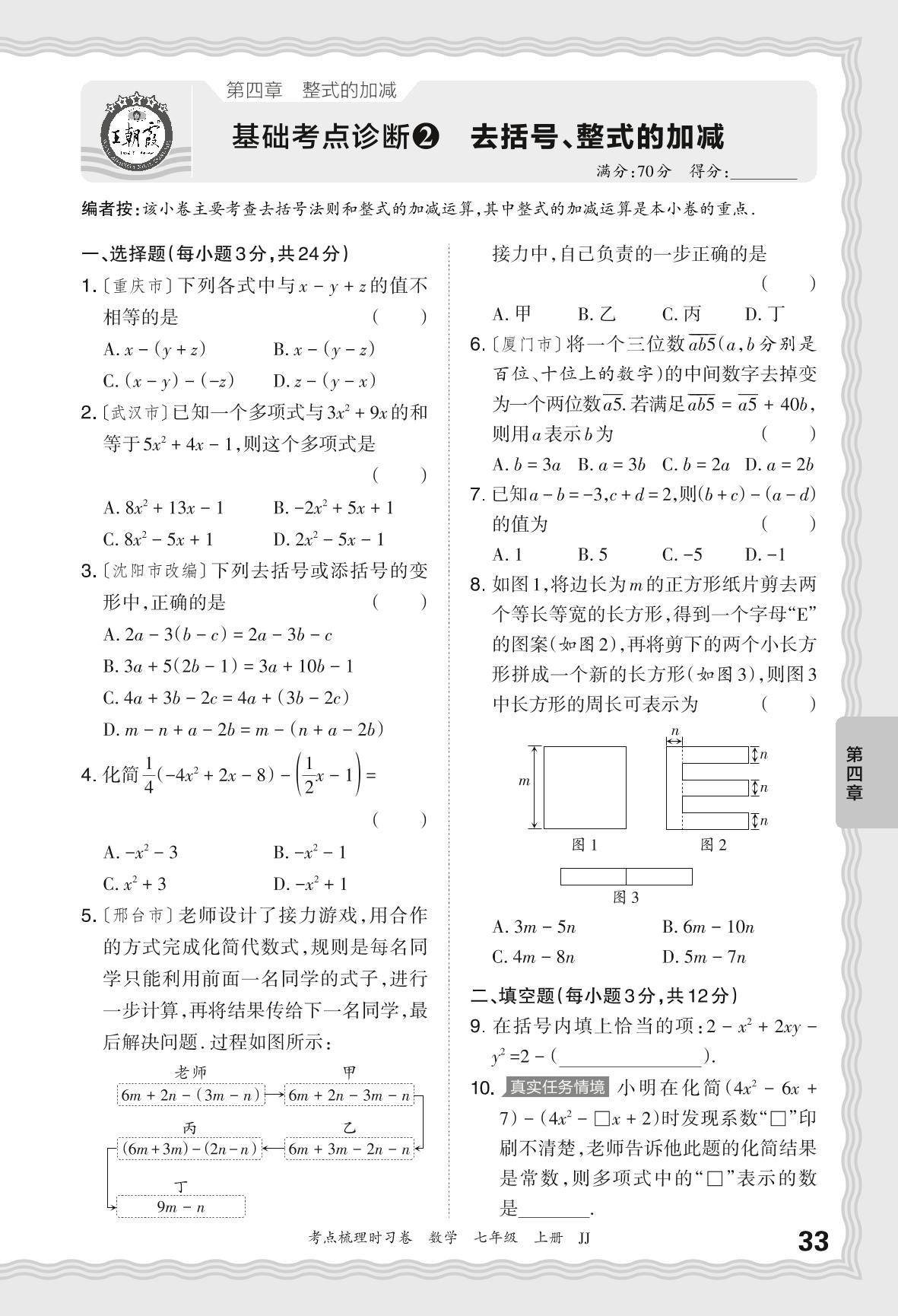 2024秋上册七年级数学冀教版 第四章 基础考点诊断 去括号、整式的加减【2】