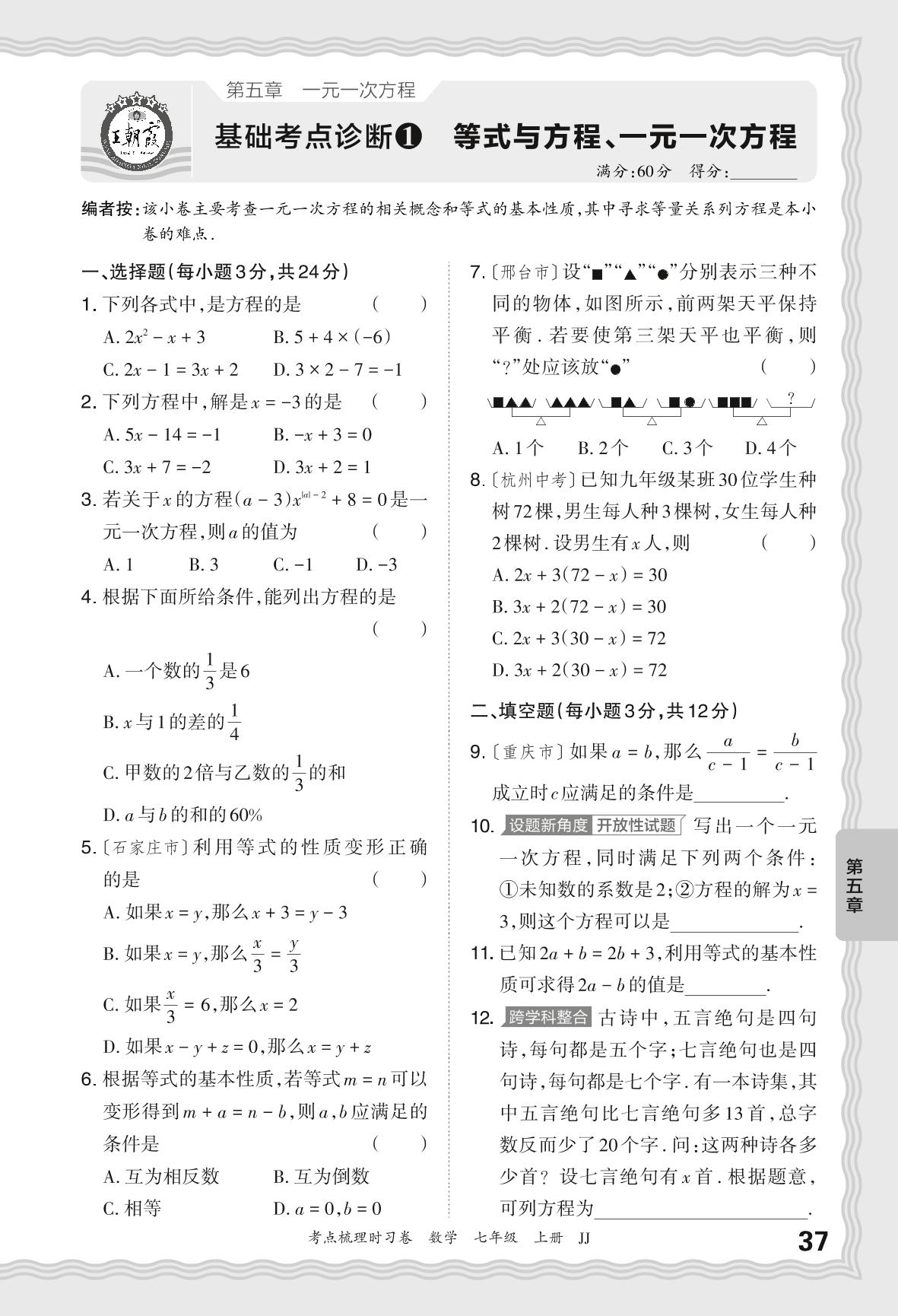 2024秋上册七年级数学冀教版 第五章 基础考点诊断 等式与方程、一元一次方程【1】