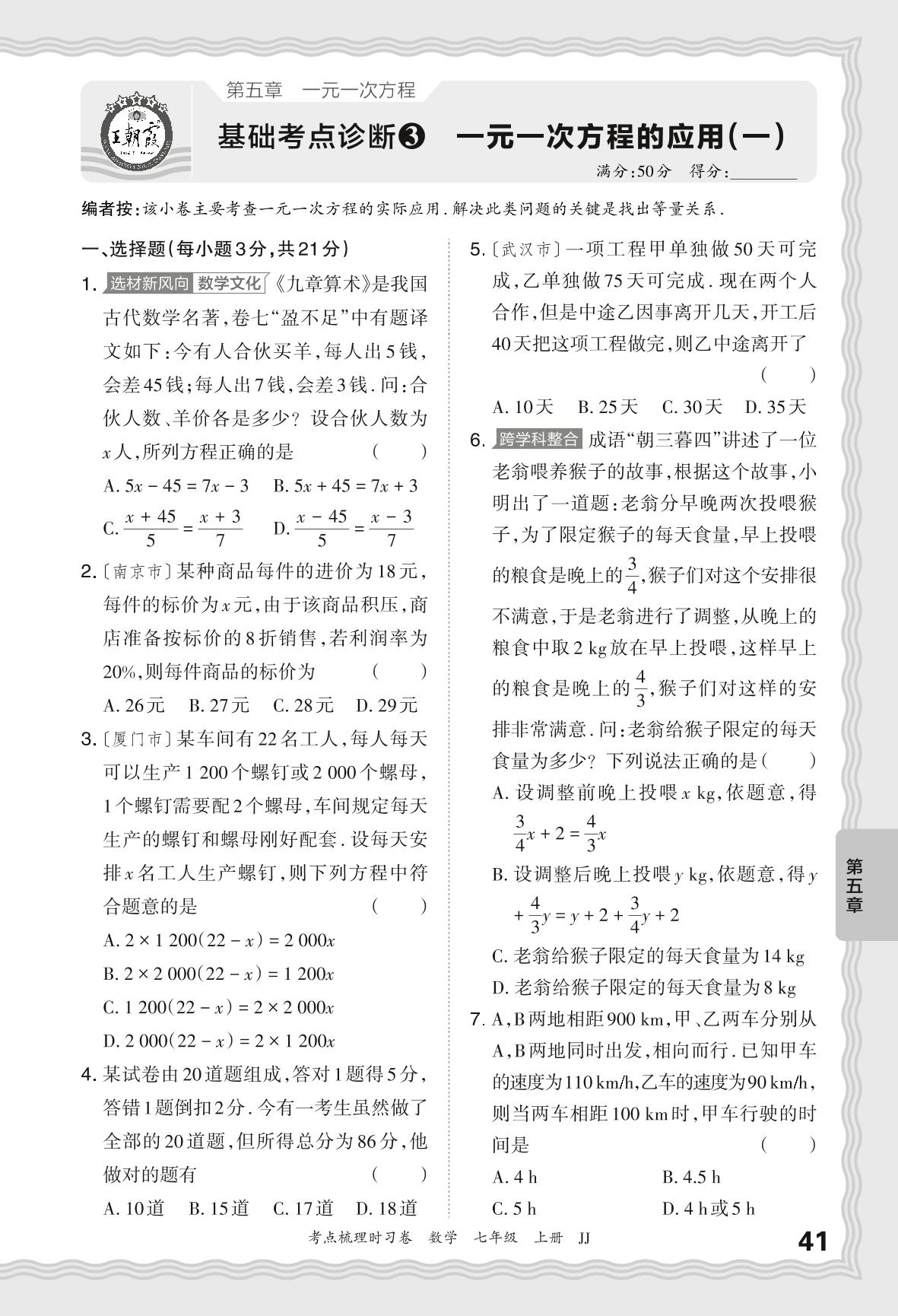 2024秋上册七年级数学冀教版 第五章 基础考点诊断 一元一次方程的应用(一)【3】