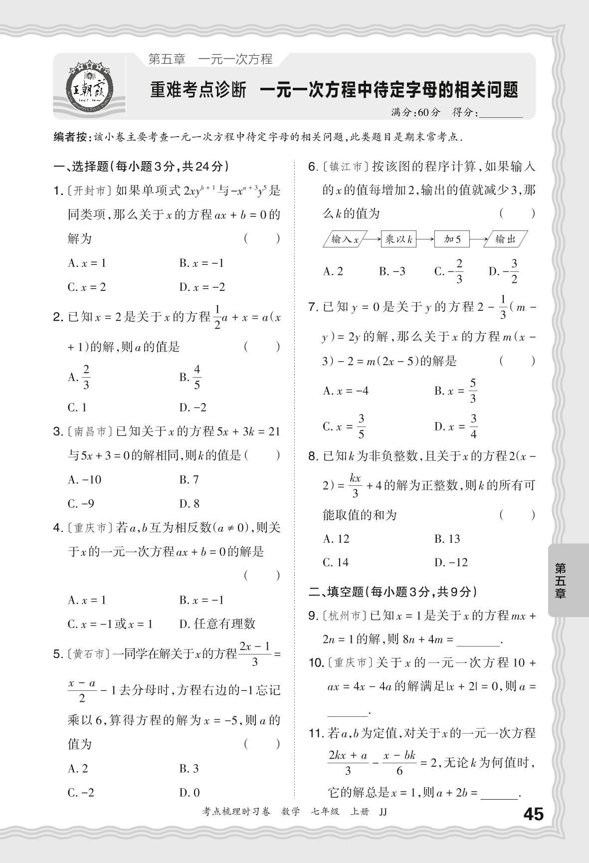 2024秋上册七年级数学冀教版 第五章 重难考点诊断 一元一次方程中待定字母的相关问题