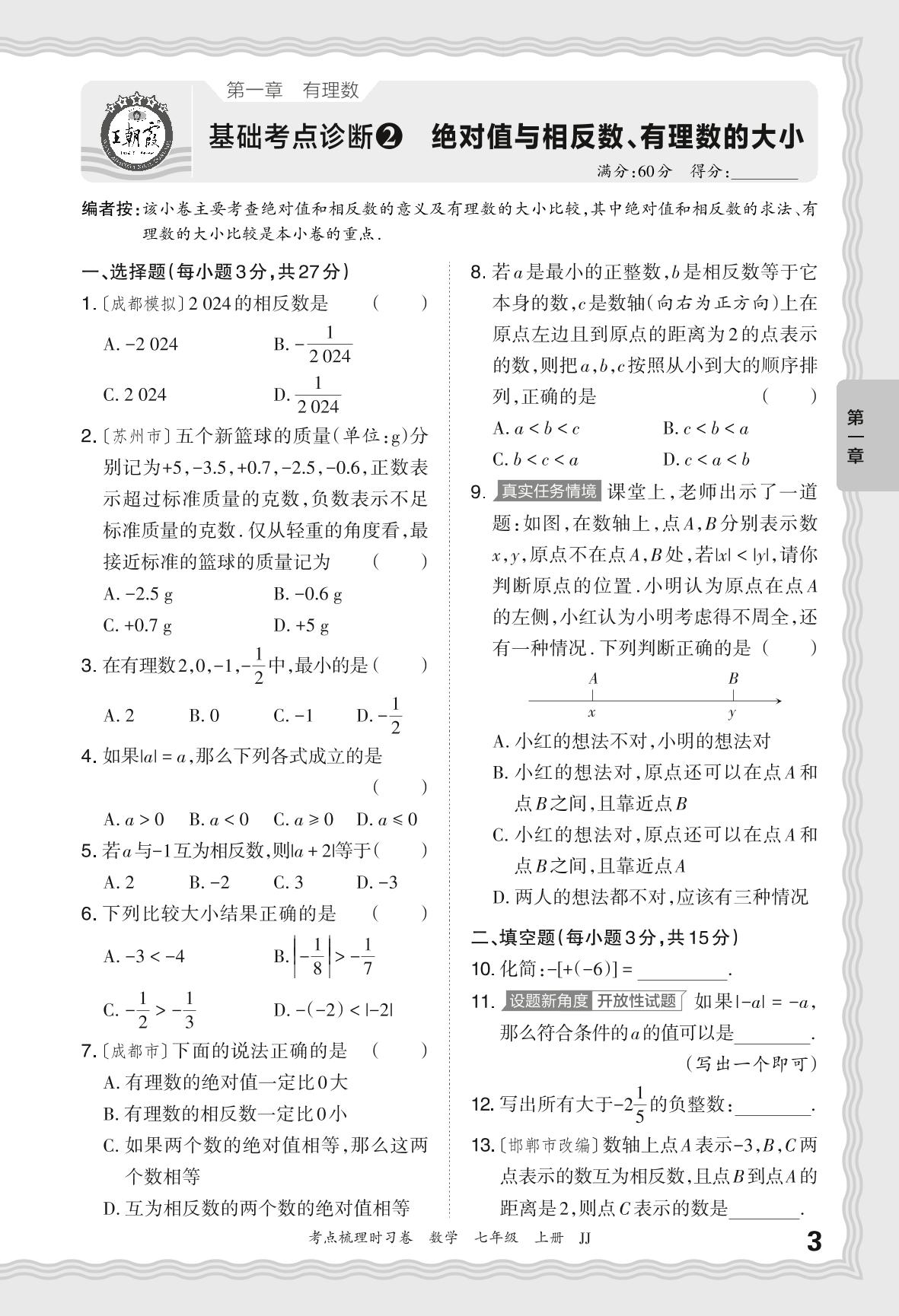 2024秋上册七年级数学冀教版 第一章 基础考点诊断 绝对值与相反数、有理数的大小【2】