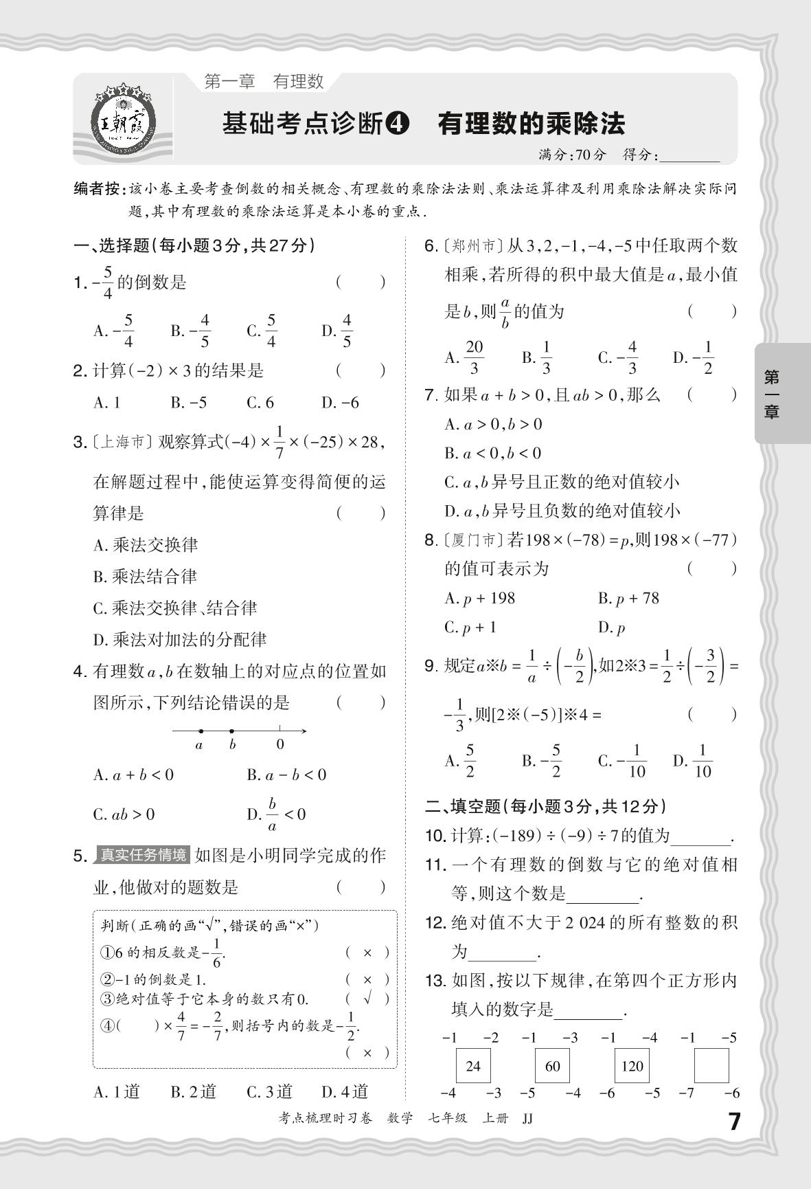 2024秋上册七年级数学冀教版 第一章 基础考点诊断 有理数的乘除法【4】