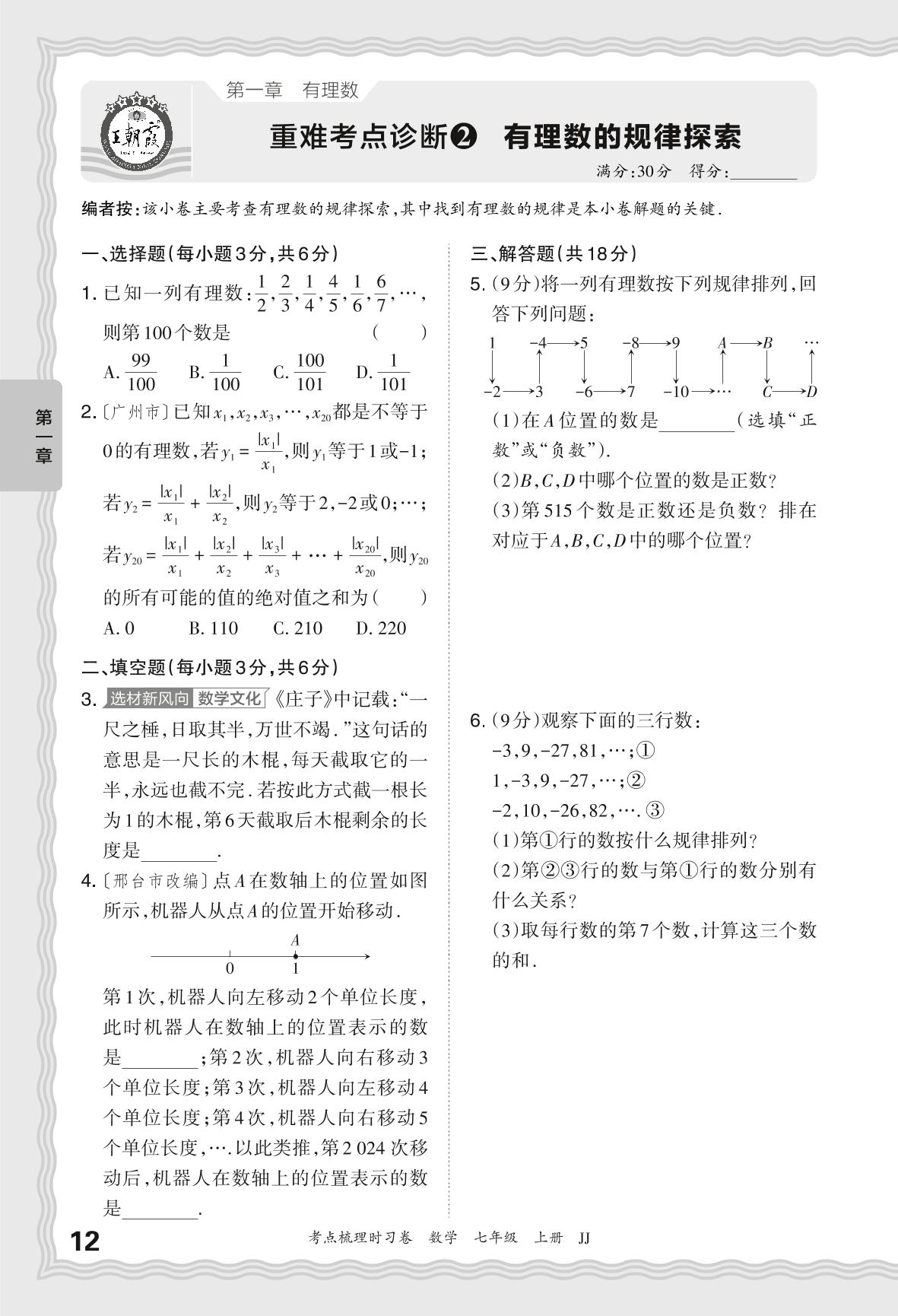 2024秋上册七年级数学冀教版 第一章 重难考点诊断 有理数的规律探索【2】