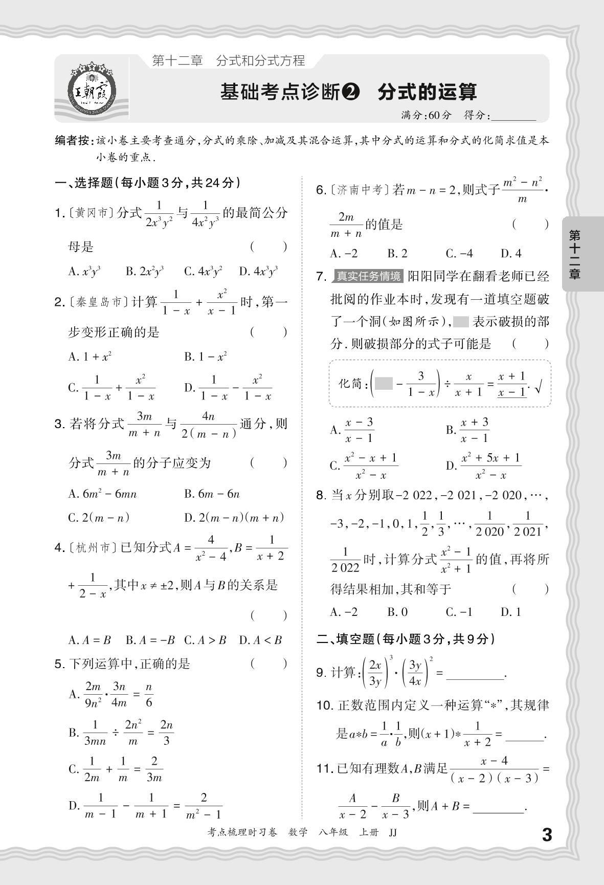 2024秋上册八年级数学冀教版 第十二章 基础考点诊断 分式的运算【2】