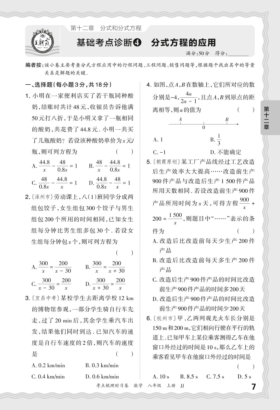 2024秋上册八年级数学冀教版 第十二章 基础考点诊断 分式方程的应用【4】