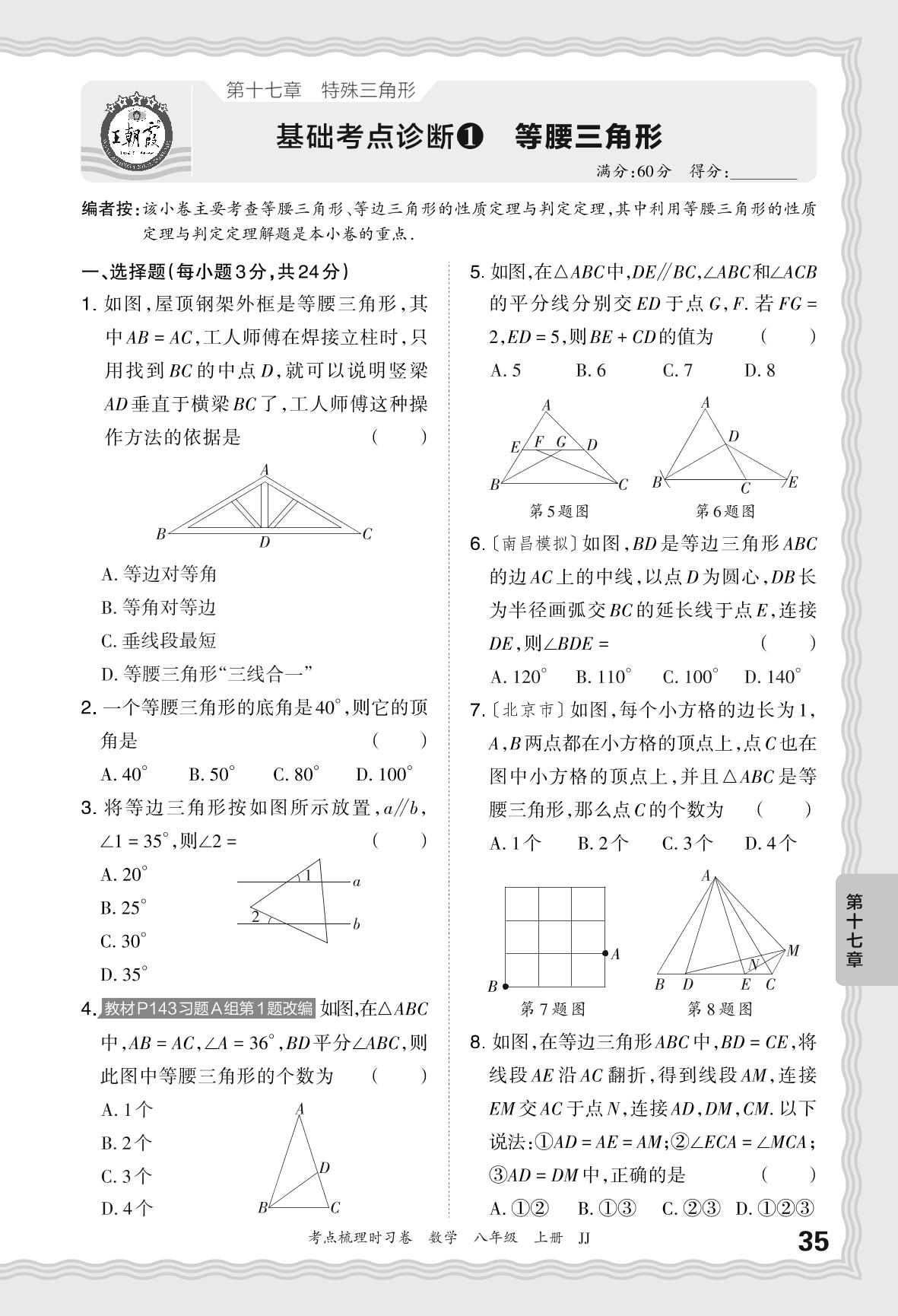 2024秋上册八年级数学冀教版 第十七章 基础考点诊断 等腰三角形【1】