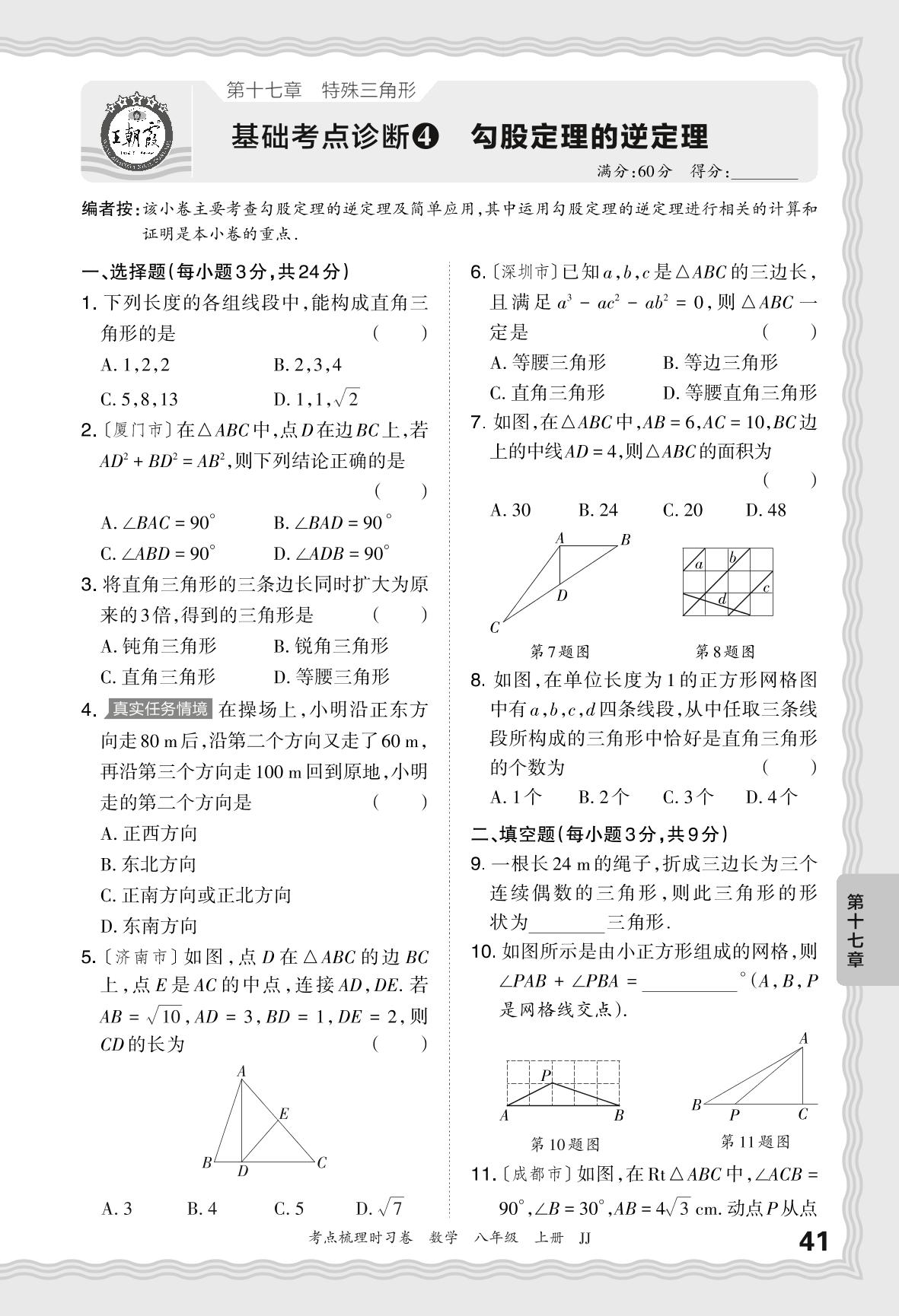 2024秋上册八年级数学冀教版 第十七章 基础考点诊断 勾股定理的逆定理【4】