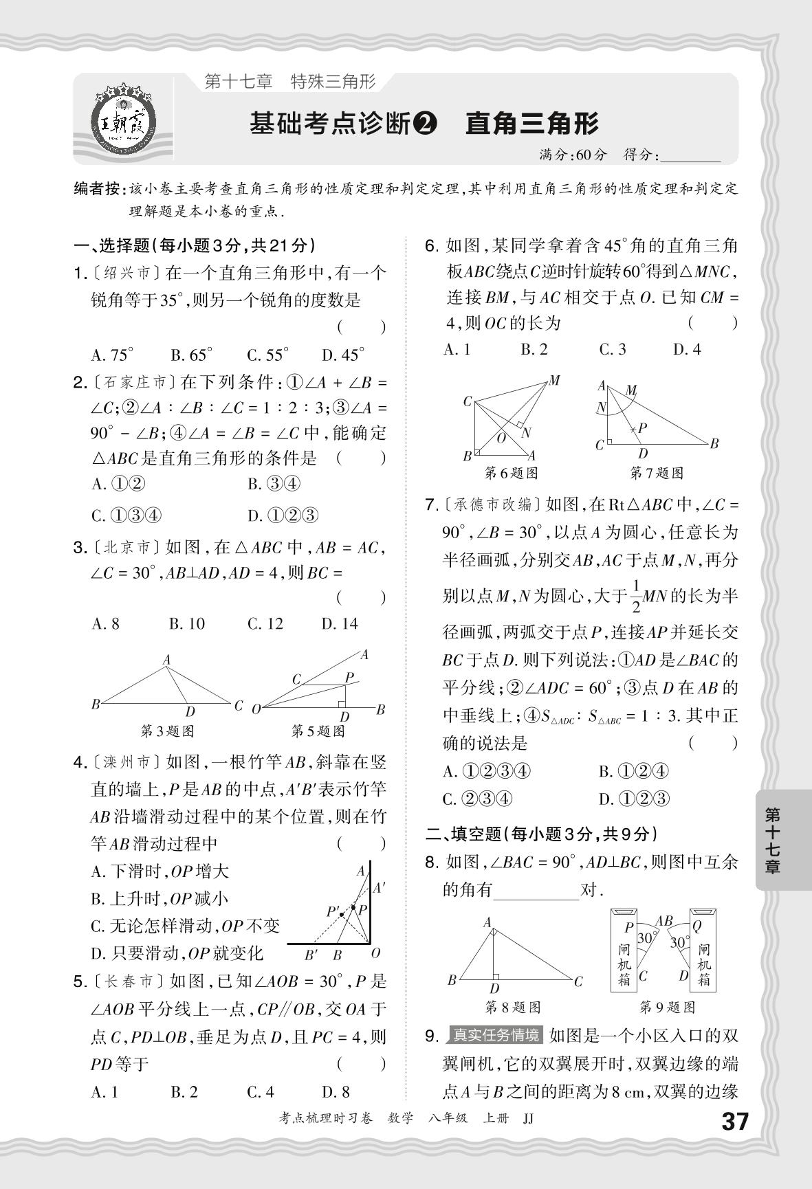 2024秋上册八年级数学冀教版 第十七章 基础考点诊断 直角三角形【2】