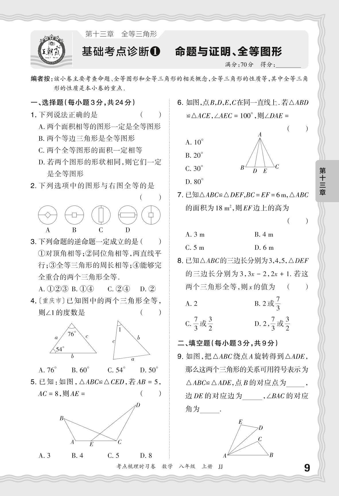 2024秋上册八年级数学冀教版 第十三章 基础考点诊断 命题与证明、全等图形【1】