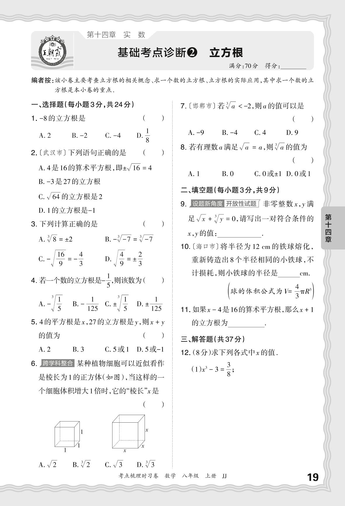 2024秋上册八年级数学冀教版 第十四章 基础考点诊断 立方根【2】
