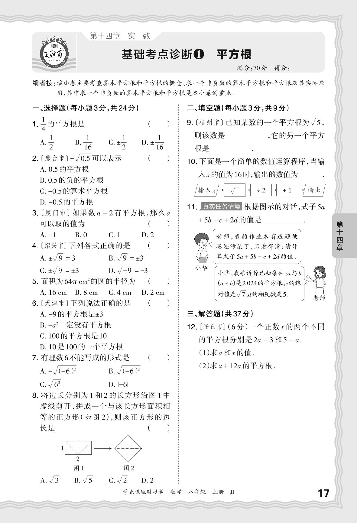 2024秋上册八年级数学冀教版 第十四章 基础考点诊断 平方根【1】