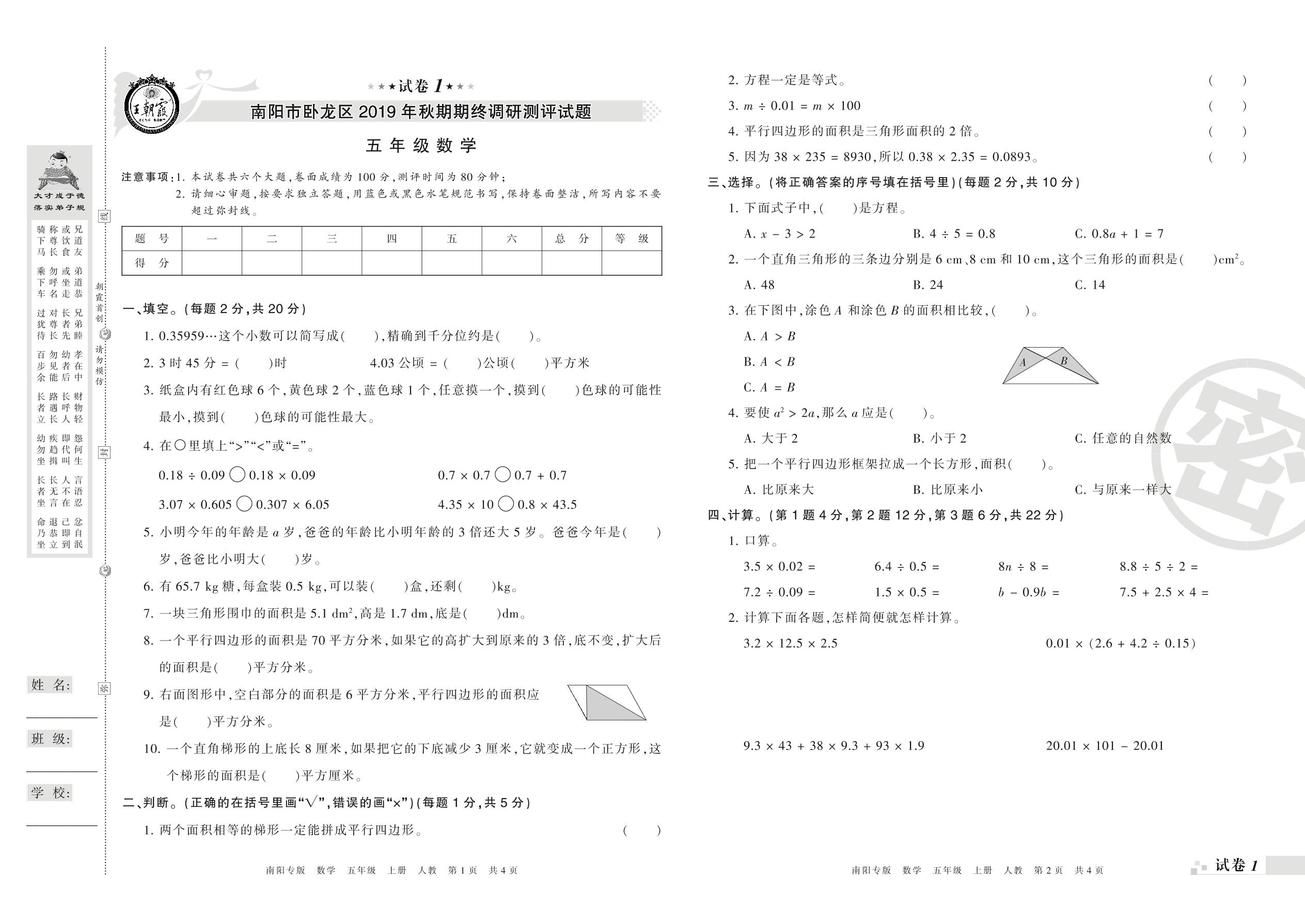 2019-2020学年第一学期南阳市卧龙区五年级数学试卷(人教版)【1】