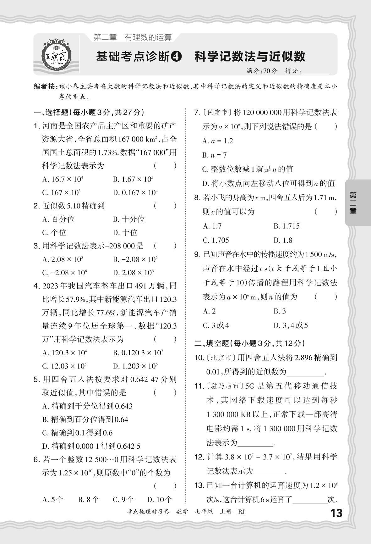 2024秋上册七年级数学人教版 第二章 基础考点诊断 科学记数法与近似数【4】