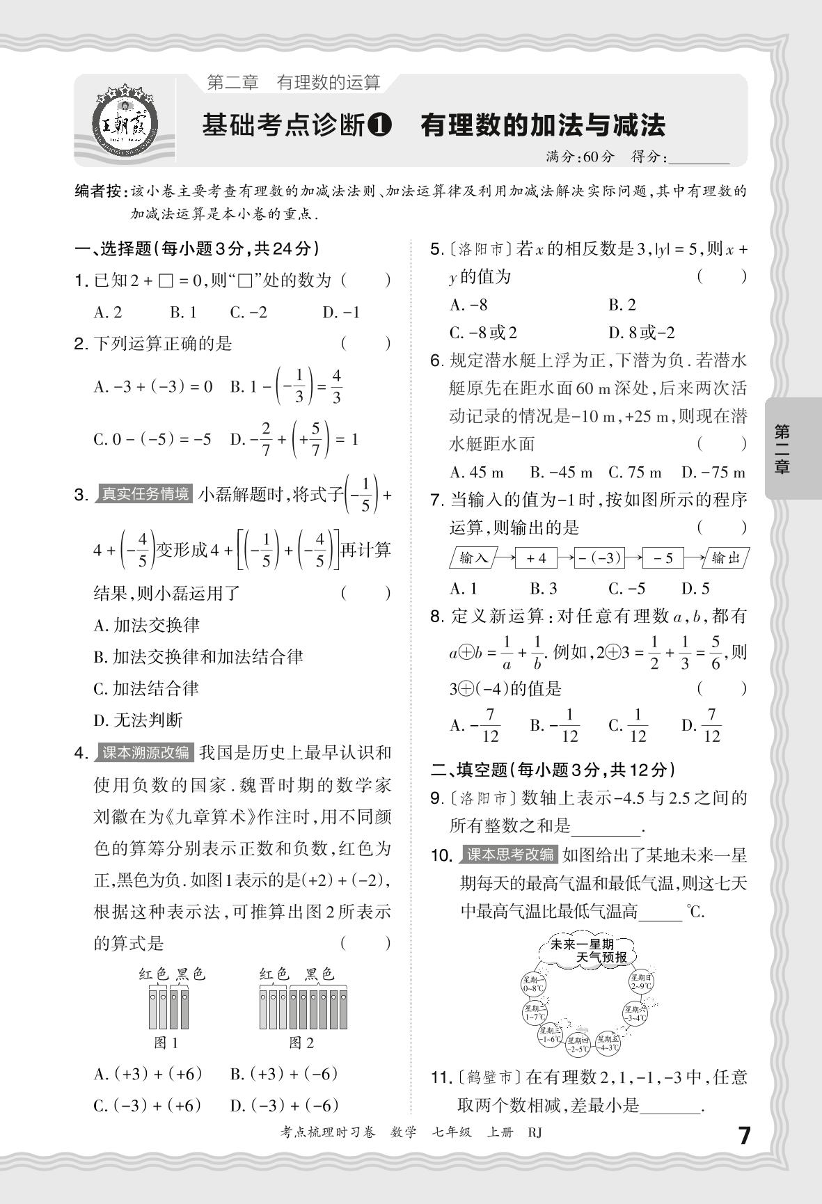 2024秋上册七年级数学人教版 第二章 基础考点诊断 有理数的加法与减法【1】