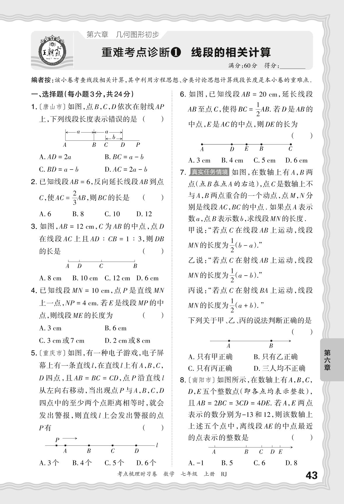 2024秋上册七年级数学人教版 第六章 重难考点诊断 线段的相关计算【1】