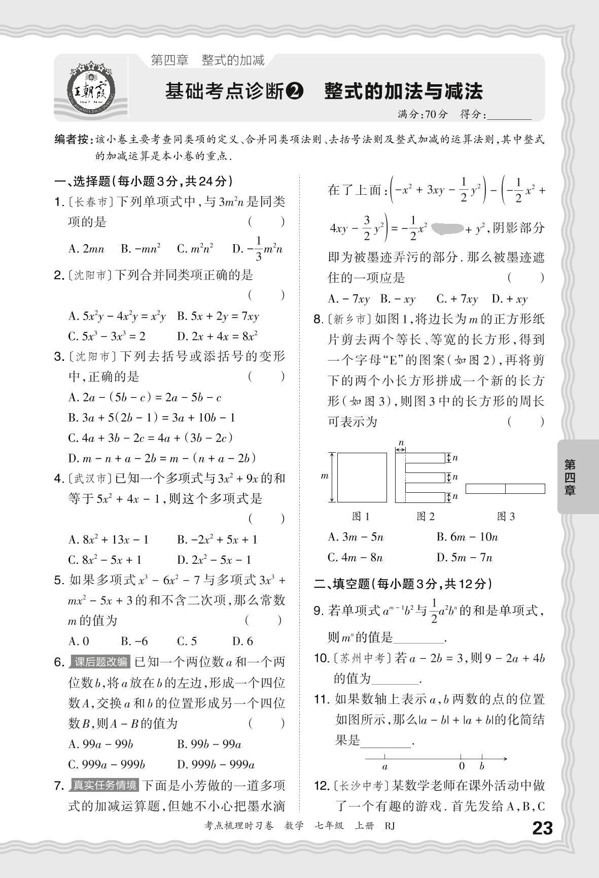 2024秋上册七年级数学人教版 第四章 基础考点诊断 整式的加法与减法【2】