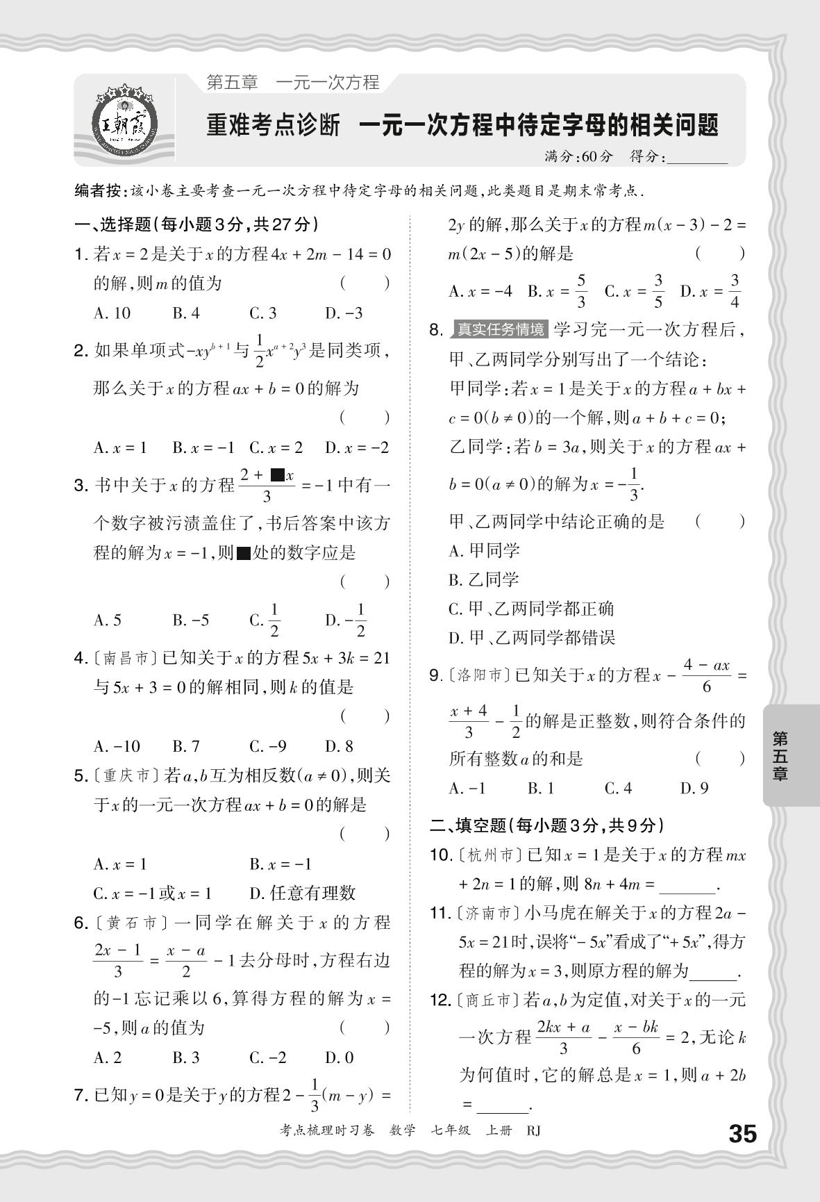 2024秋上册七年级数学人教版 第五章 重难考点诊断 一元一次方程中待定字母的相关问题