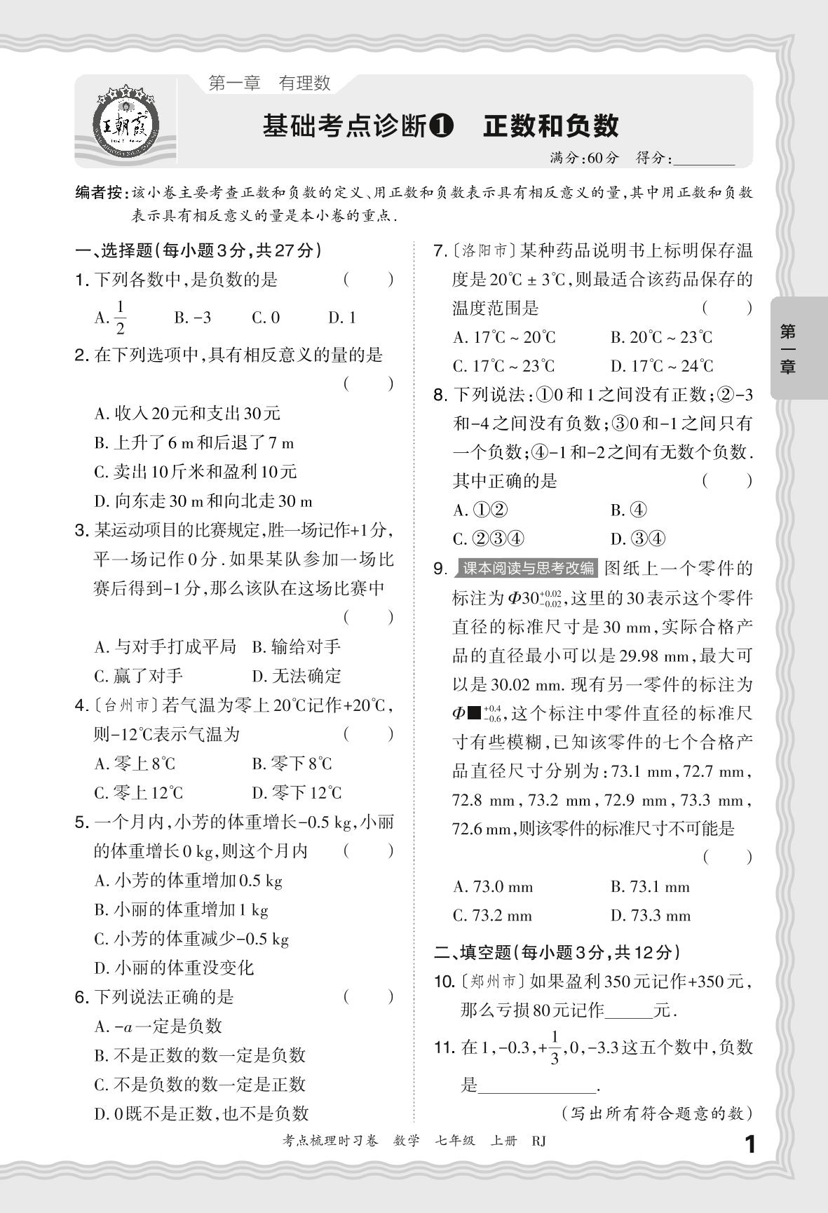 2024秋上册七年级数学人教版 第一章 基础考点诊断 正数和负数【1】