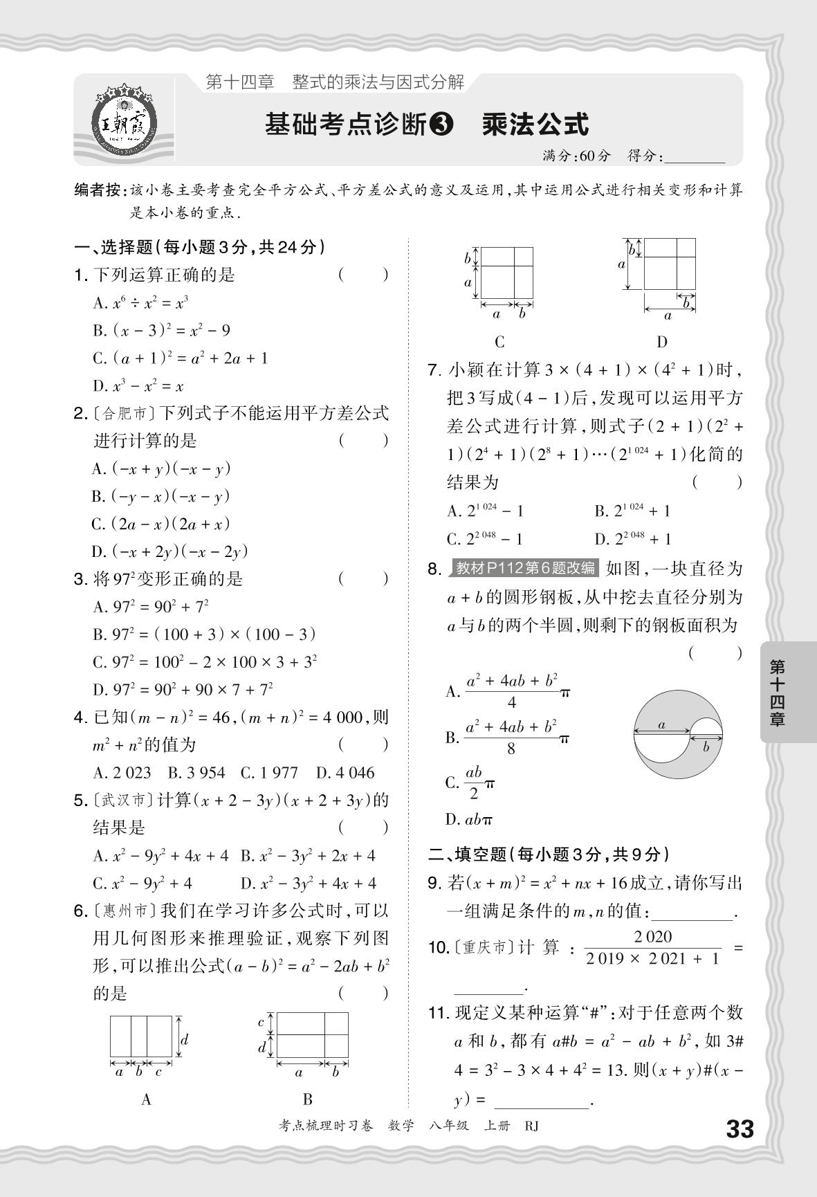 2024秋上册八年级数学人教版 第十四章 基础考点诊断 乘法公式【3】