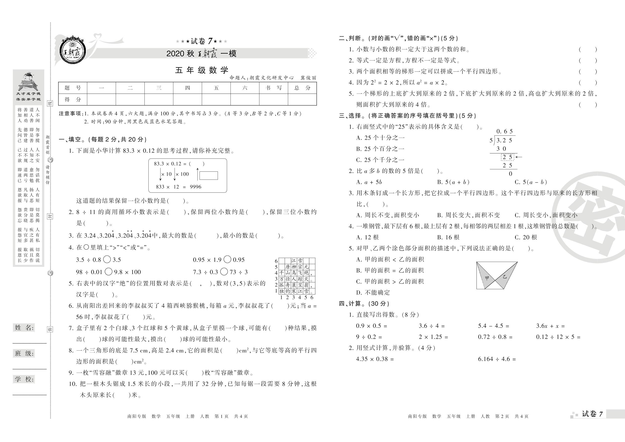 王朝霞期末模拟卷五年级上册数学(人教版)_R210804164157【7】