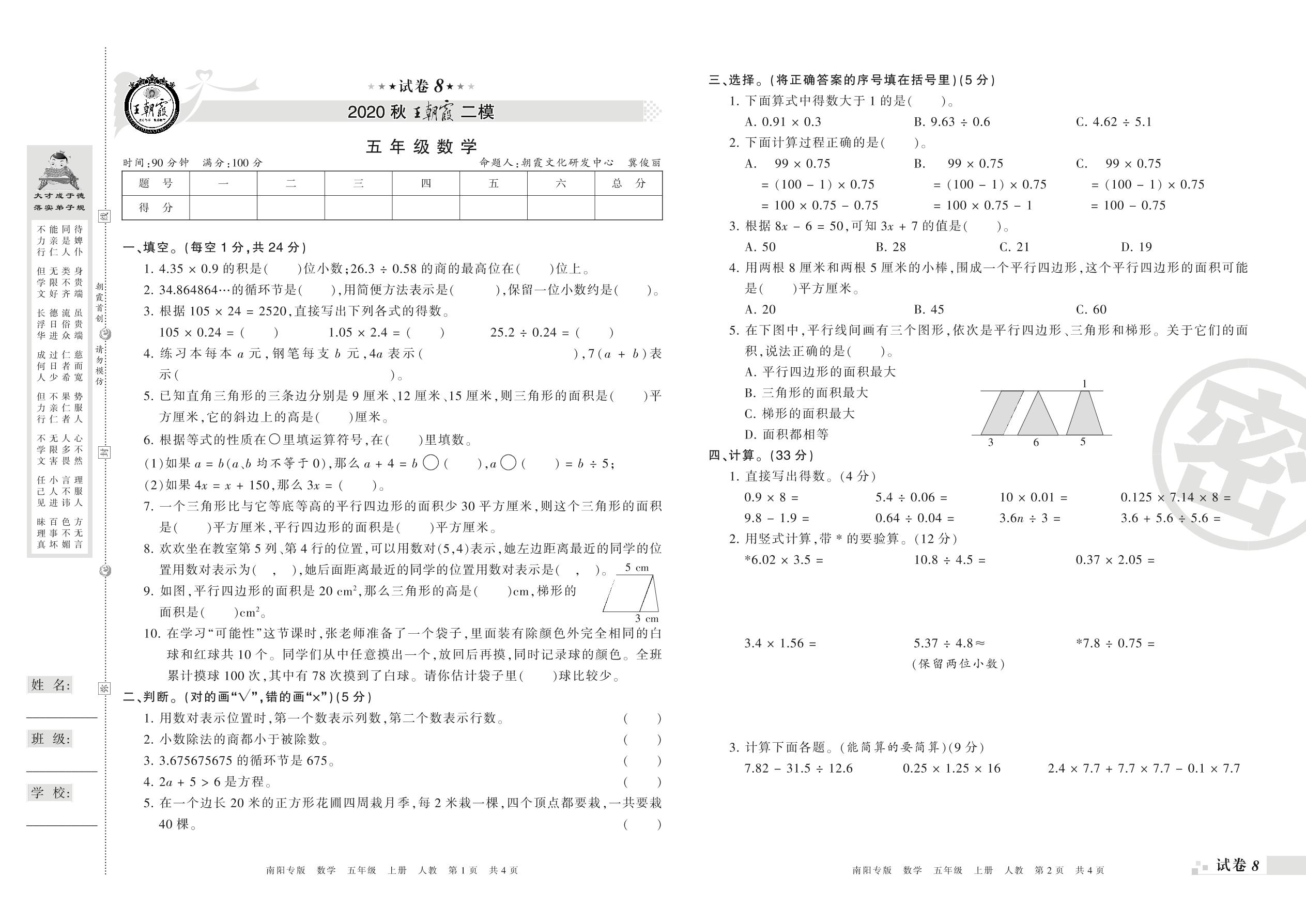 王朝霞期末模拟卷五年级上册数学(人教版)_R210804164201【8】