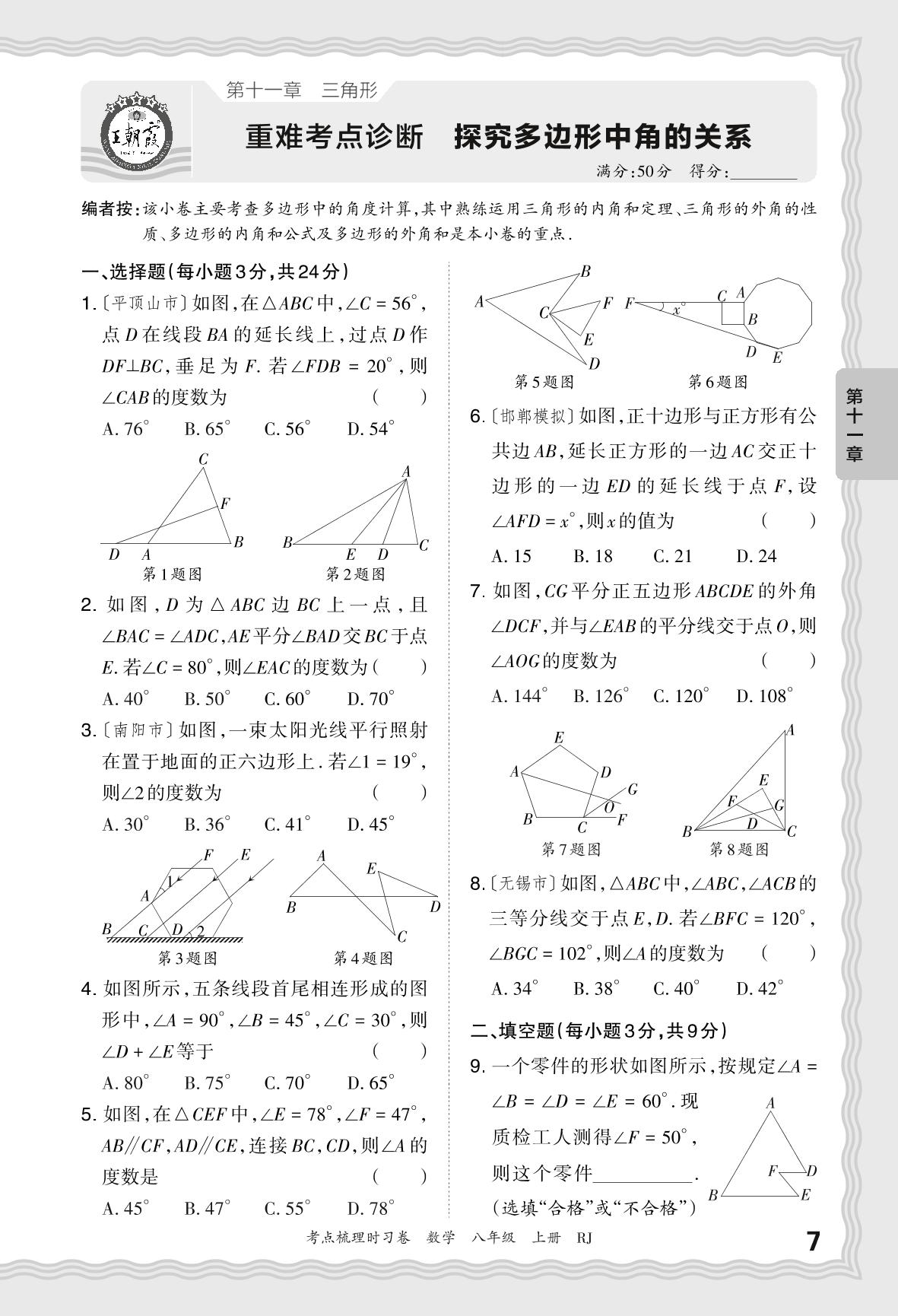 2024秋上册八年级数学人教版 第十一章 重难考点诊断 探究多边形中角的关系