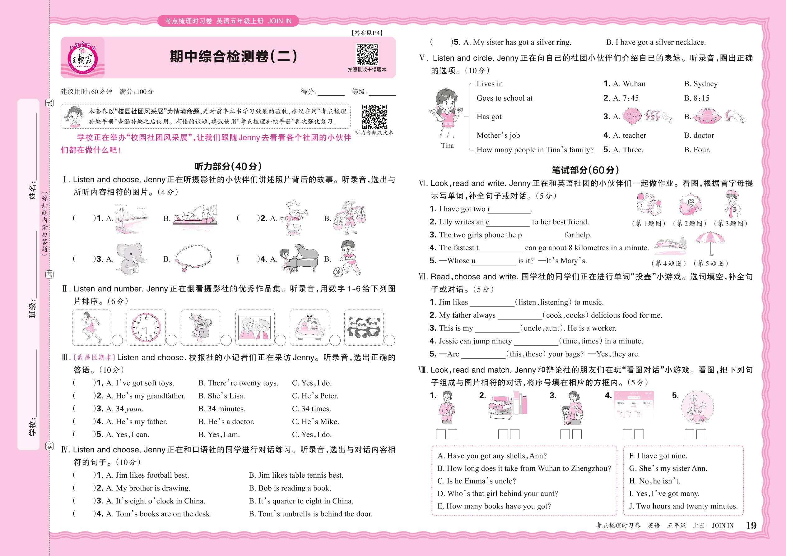五年级英语剑桥版上册期中卷