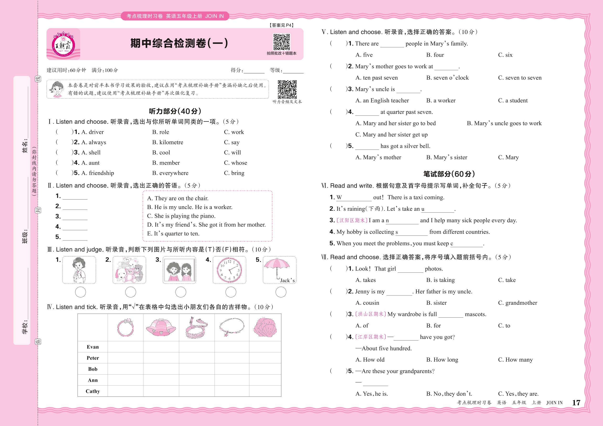 五年级英语剑桥版上册期中卷